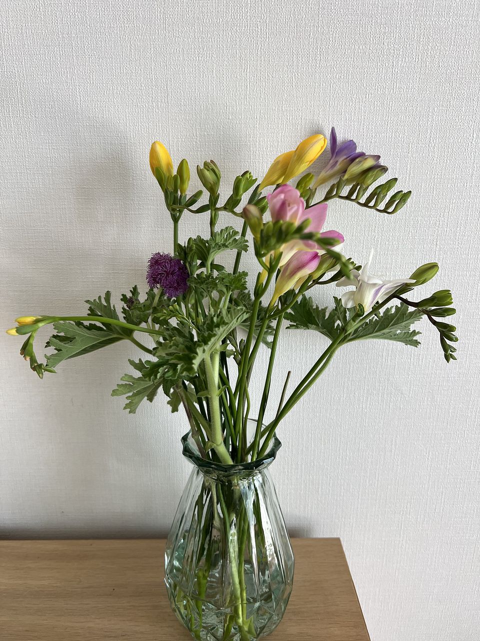 水漏れによる水下がりが少し気になったのですが、深水で水揚げしたらすぐに反応してくれて蕾の先端までハリが戻ってきました。