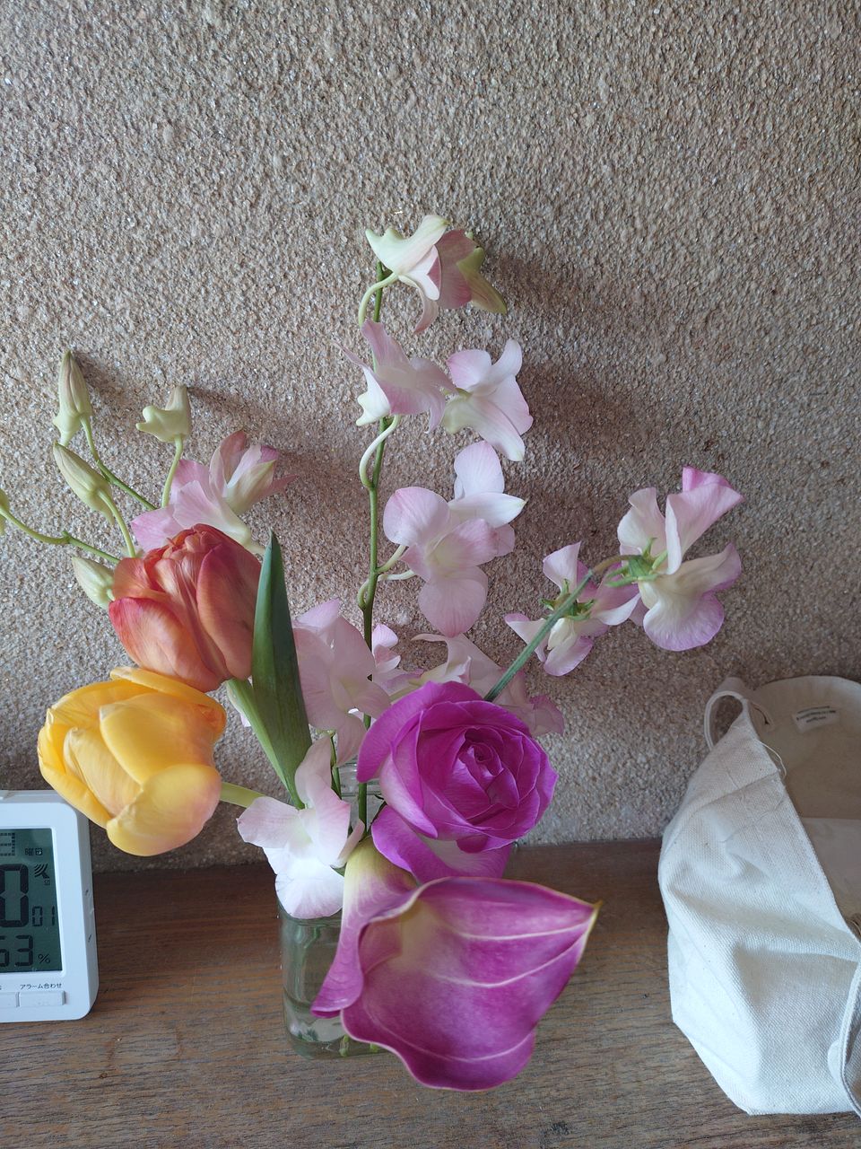 初めてデンファレを飾って見ました どう扱ったらいいのか、花を落とさないようにビクビクしながら飾りました ベース選びが難しかったけど何とかできました。 お部屋にも春が来たようです