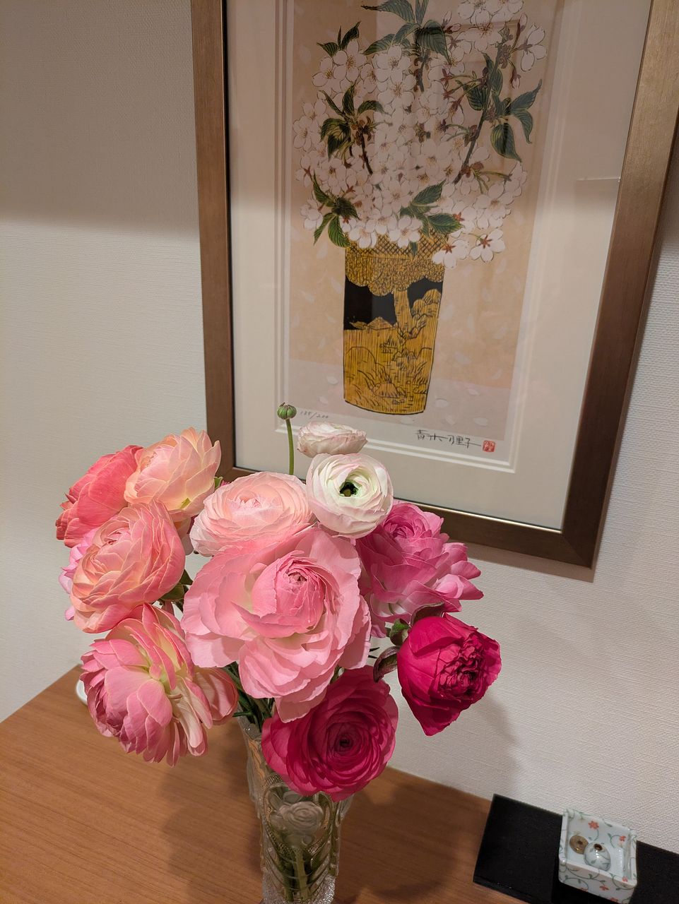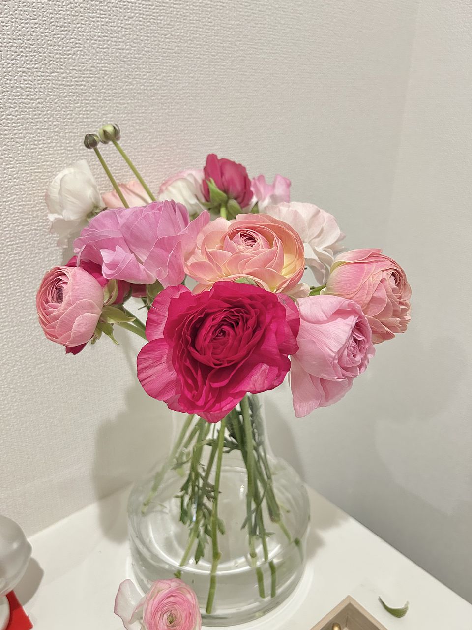 思っていたより赤に近いピンクが多く やはり、写真とは違いますよね😄 でも、お花があると気持ちが違うので ありがとうございます😊 大好きなラナンキュラスです❣️