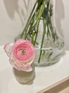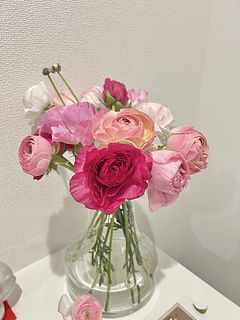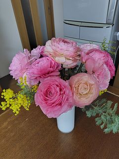 ピーチミルクのおまかせブーケに入っていたラナンキュラスがとてもきれいで持ちも良く、1ヶ月くらい楽しめたので、今度はラナンキュラスだけのセットを頼んでみました。 色味の違うピンクが可愛らしいです。 水揚げをと思ってちょっと暖かいリビングに置いておいたら3〜4時間で一気に開いて焦りました。 今度も長く楽しめるといいです。