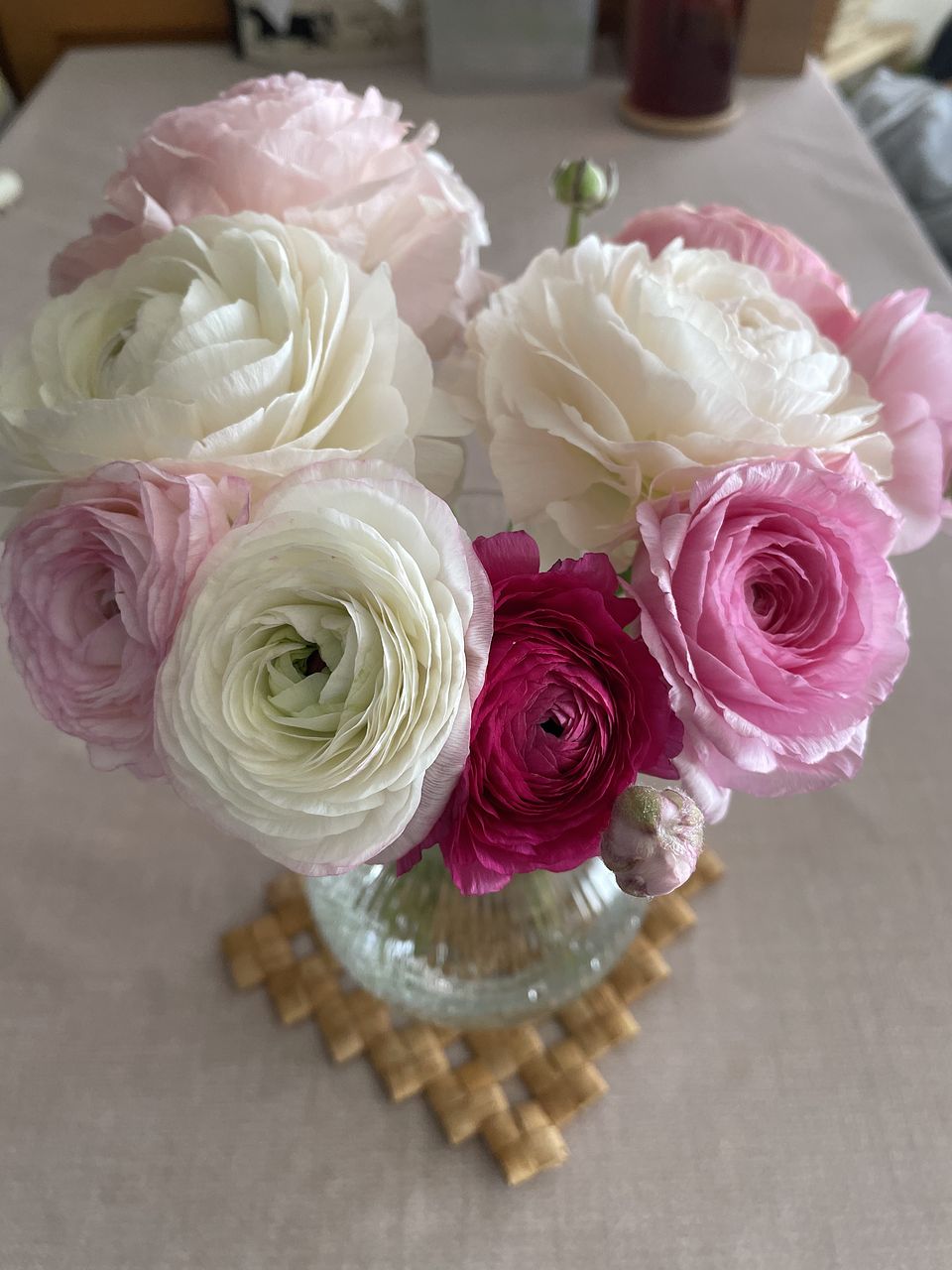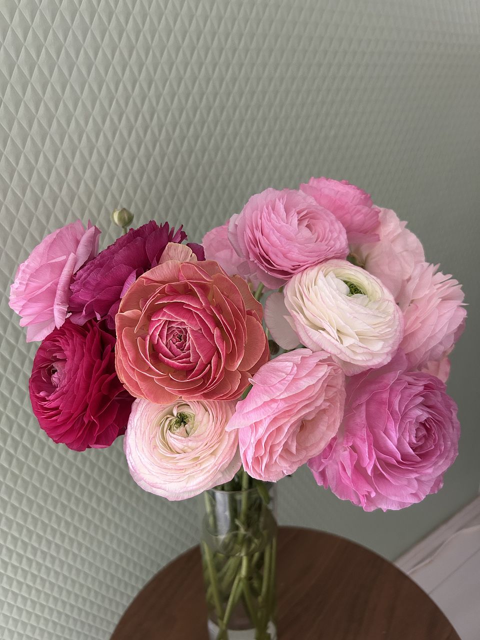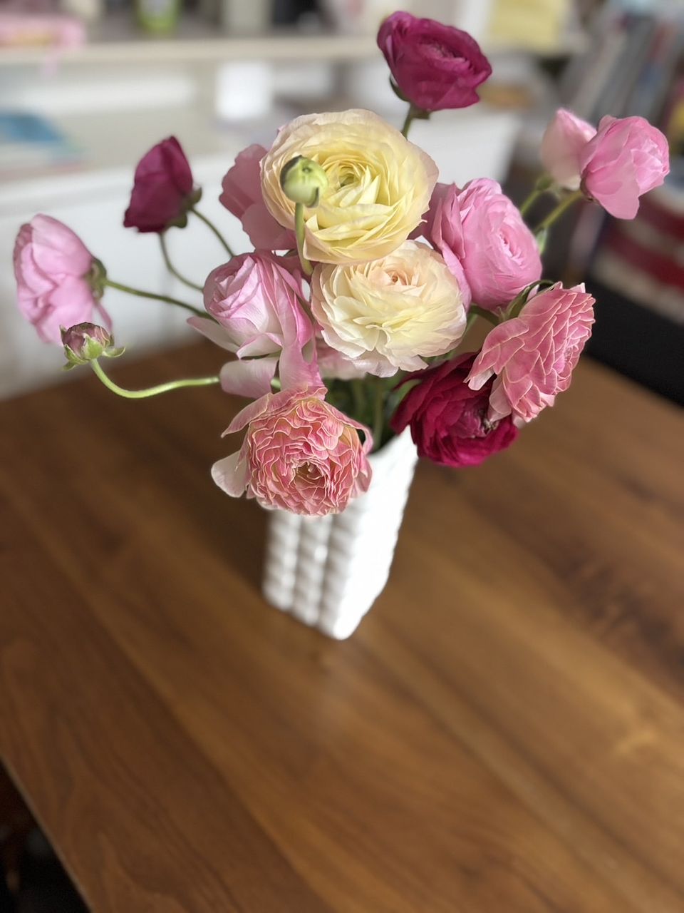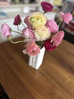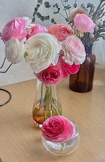 前回注文したラナンキュラスがとても可愛く長持ちしたので、リピートしました。 前回は淡いピンクばかりでしたが今回は濃い色も数本入っていて、いい差し色になり更に素敵で大満足です。