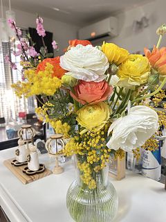 濃淡のバラエティ豊かなシトラスカラーのラナンキュラスをたっぷり束ねて。