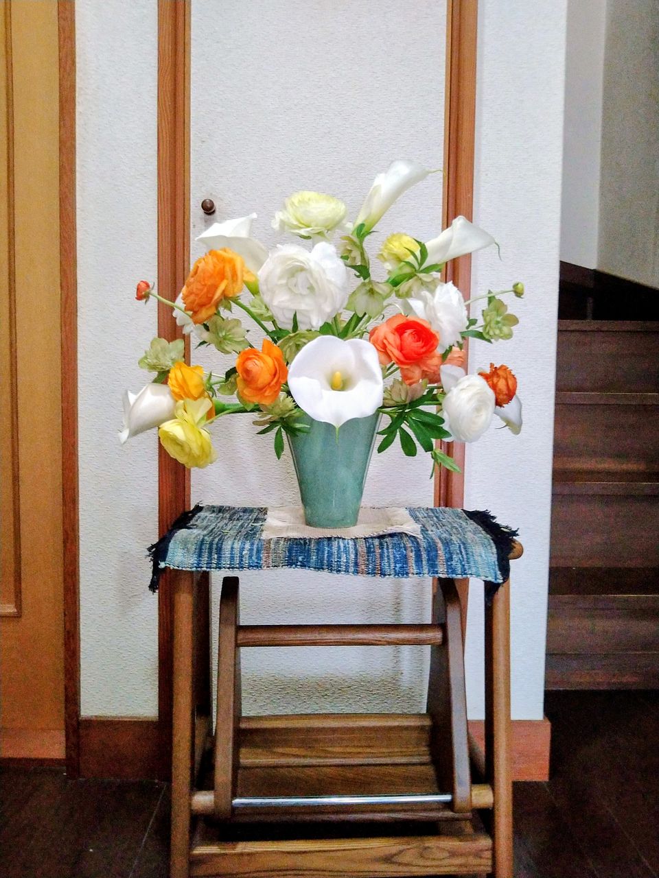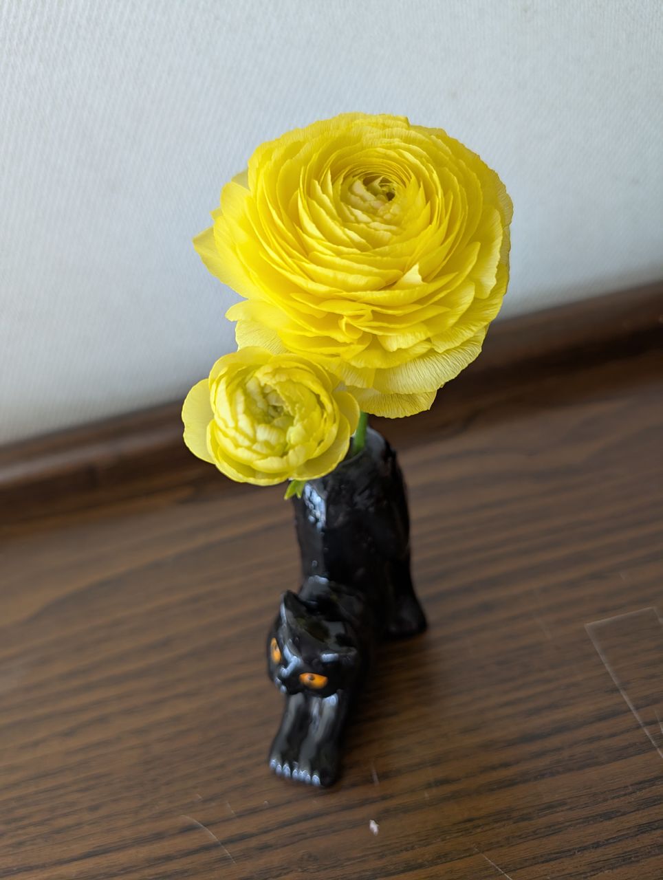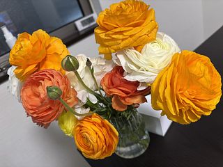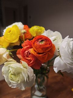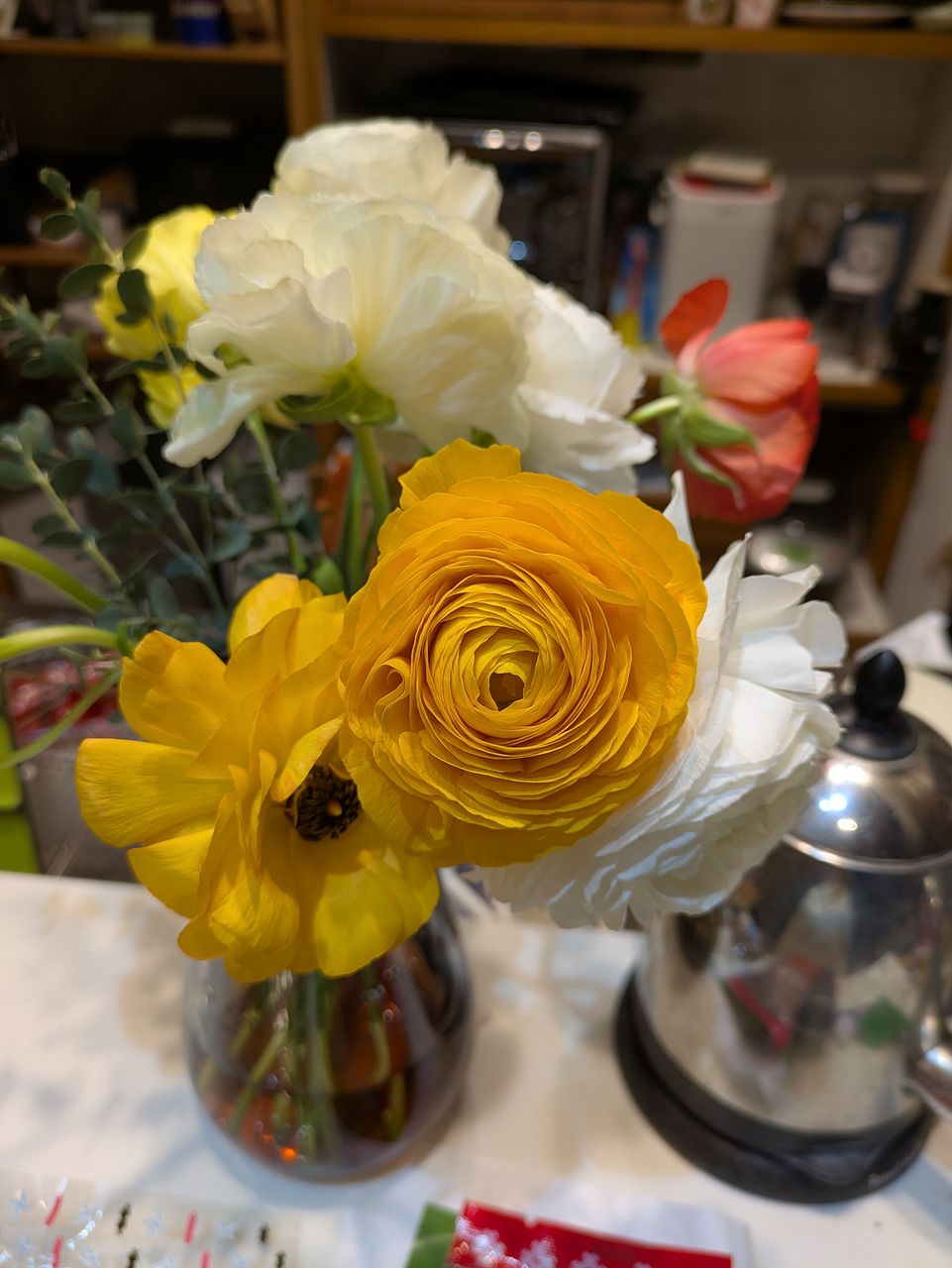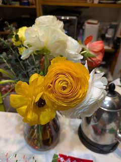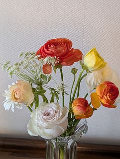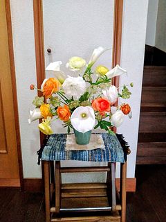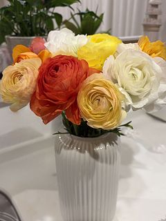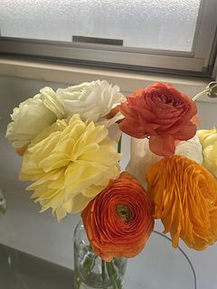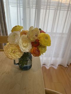 シトラスカラーのラナンキュラスが、ボリュームいっぱいで、2つの花瓶に生けました。 輸送途中で一本首が折れていたのですが、商品説明にある通り、こういう事態を見越して、1本余分に全部で13本入っていました。首が折れたものは、小さな一輪挿しに入れて楽しんでいます。