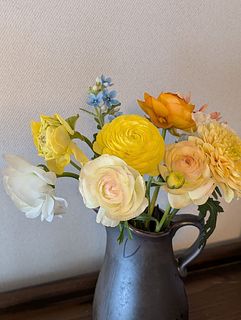 以前プレゼントでいただいてから、今回は初めて自分で購入させて貰いました。 とても優しい色味の花束でとても気に入っています。 到着から10日経ちます、花が終わってしまったものも数輪ありますがつぼみがどんどん開いてまだまだ楽しめています。 花瓶も一緒に購入したのでちょうど良いバランスで生けることが出来ました♪