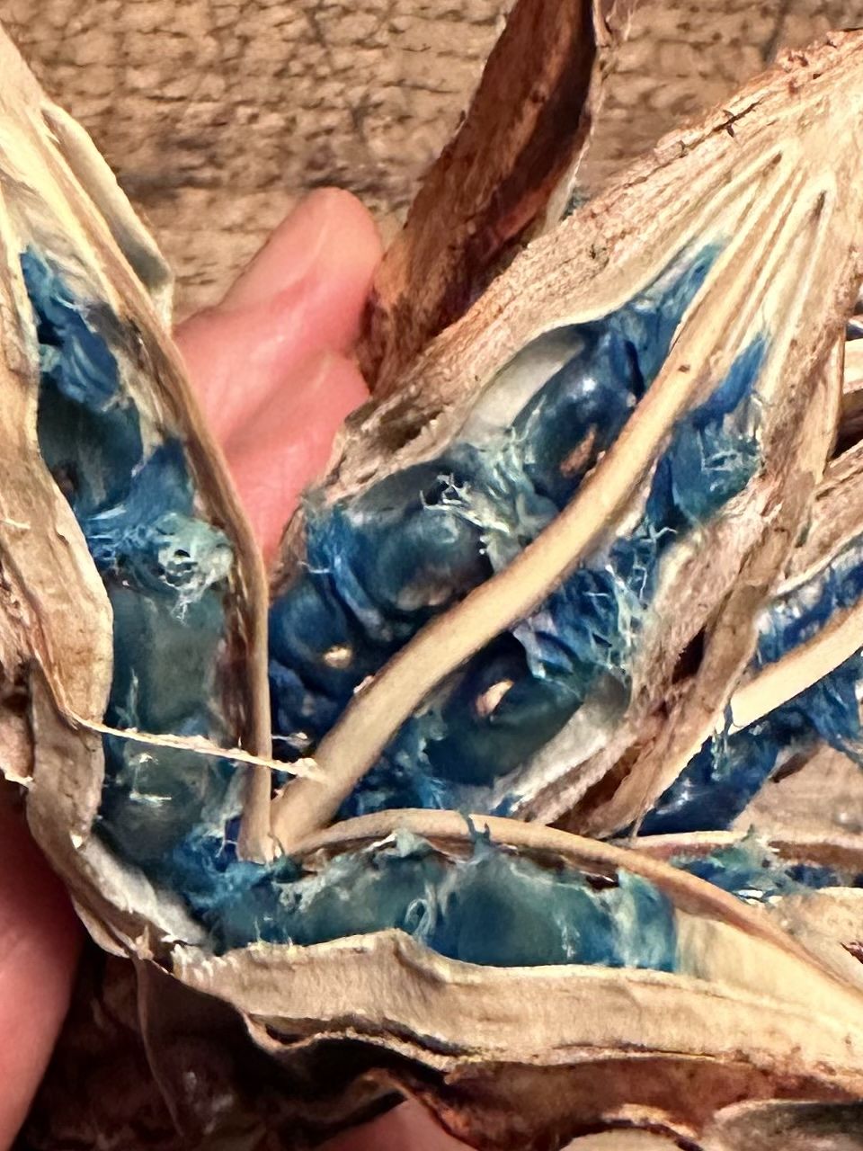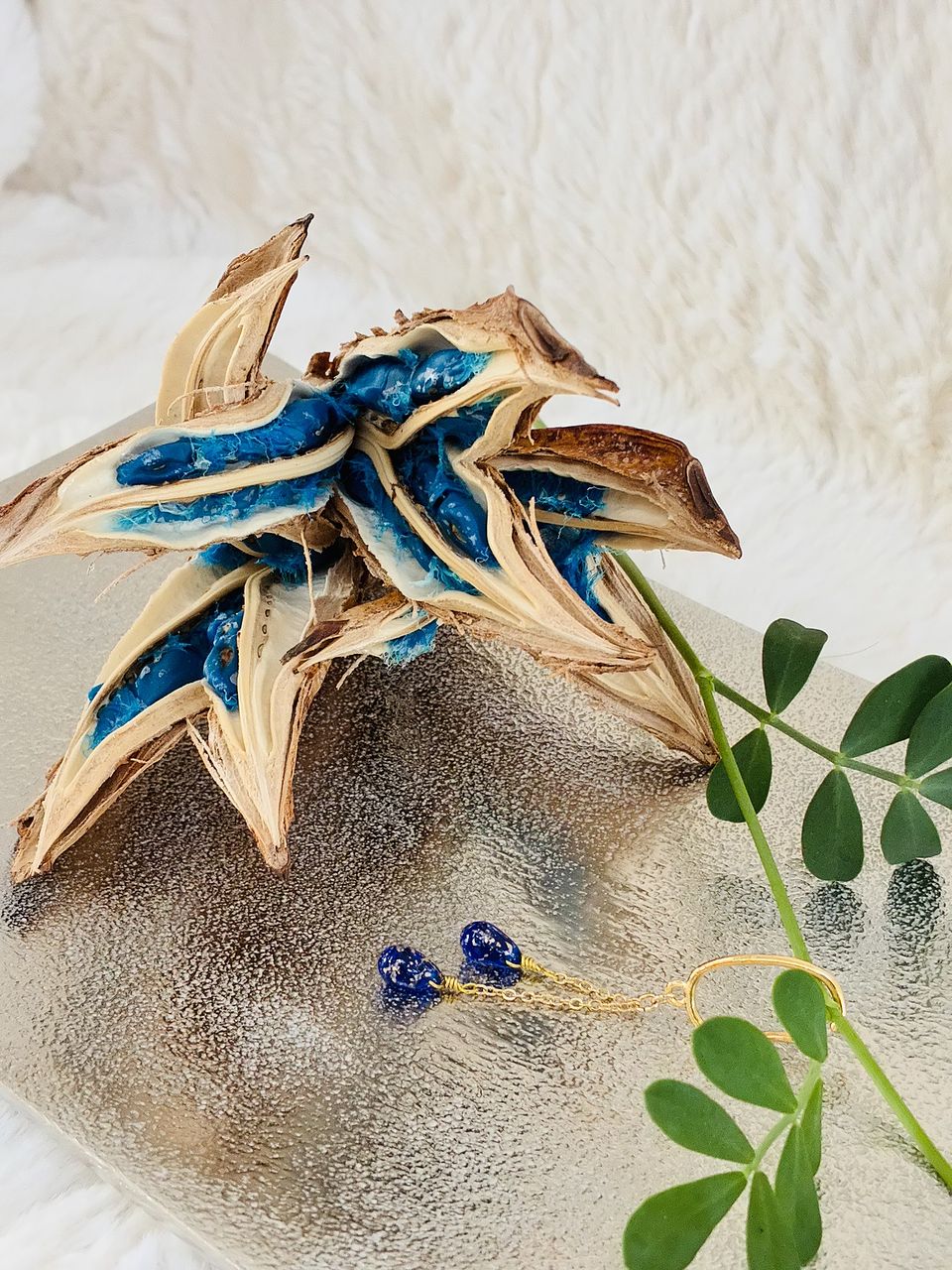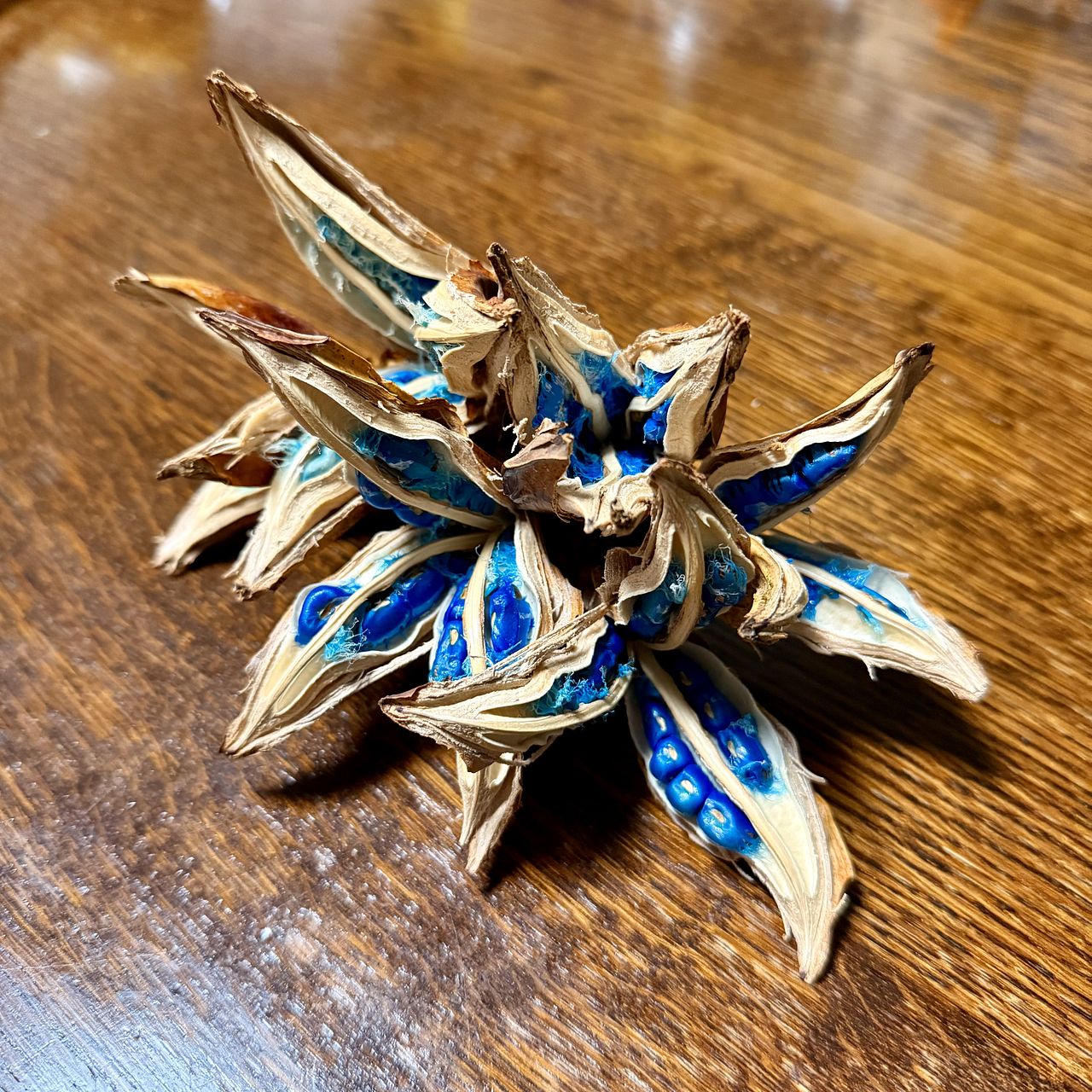 コバルトブルーの種子がとっても鮮やかで、家の中のどこに置いても素敵な空間をつくってくれます。 なんとも言えない不思議な形が、雰囲気あります。 すごく気に入っています。