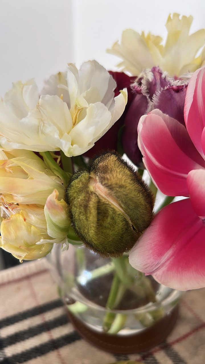 丁寧にダンボール梱包してくれてましたが 茎が柔らかく頭が重いので配送時に折れてしまったみたいです😭頭が重い子は頭近くで一度紐等で固定すると配送の際も動かず良いのかな?っと思いました。っがしかし、めっちゃ可愛い🩷です。 本当手のひら🫲程に大きくて一本は開花し始めており、他はしっかりと蕾なので楽しめる期間も長そうです😃 また、折れてた子も小さな花瓶に♡ それはそれで可愛い🩷ですね。