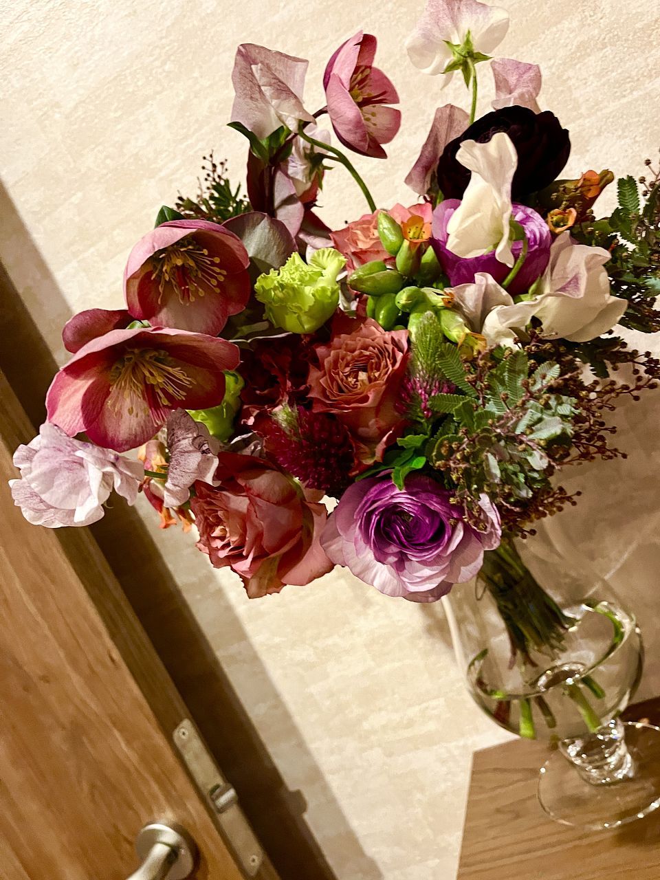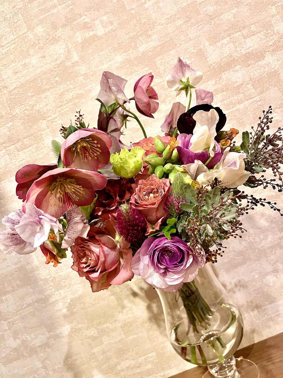 素敵なスパイラルブーケが届きました💐 シックな色合いがもうたまらないです💜 スイトピーからはいい香りがします😍 そしてプリプリのカランコエがかわいい🩷 今まで購入したなかで一番かも❣️