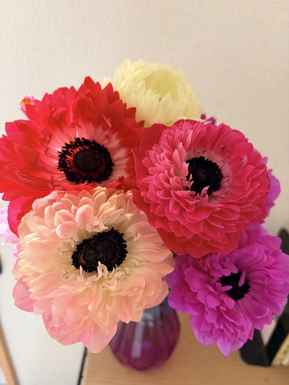 大好きなアネモネに、こんなに可愛い八重咲きがあることを知りませんでした。 頭が重そうなのだけが気の毒なのですが😅すごく可愛くて、お仕事から帰ってくる度癒されています。 紫系も好きなので、入っていなかったのが少し残念ですが、大好きな色味で嬉しいです。 次々にほしいお花が登場するので困っています😆💕
