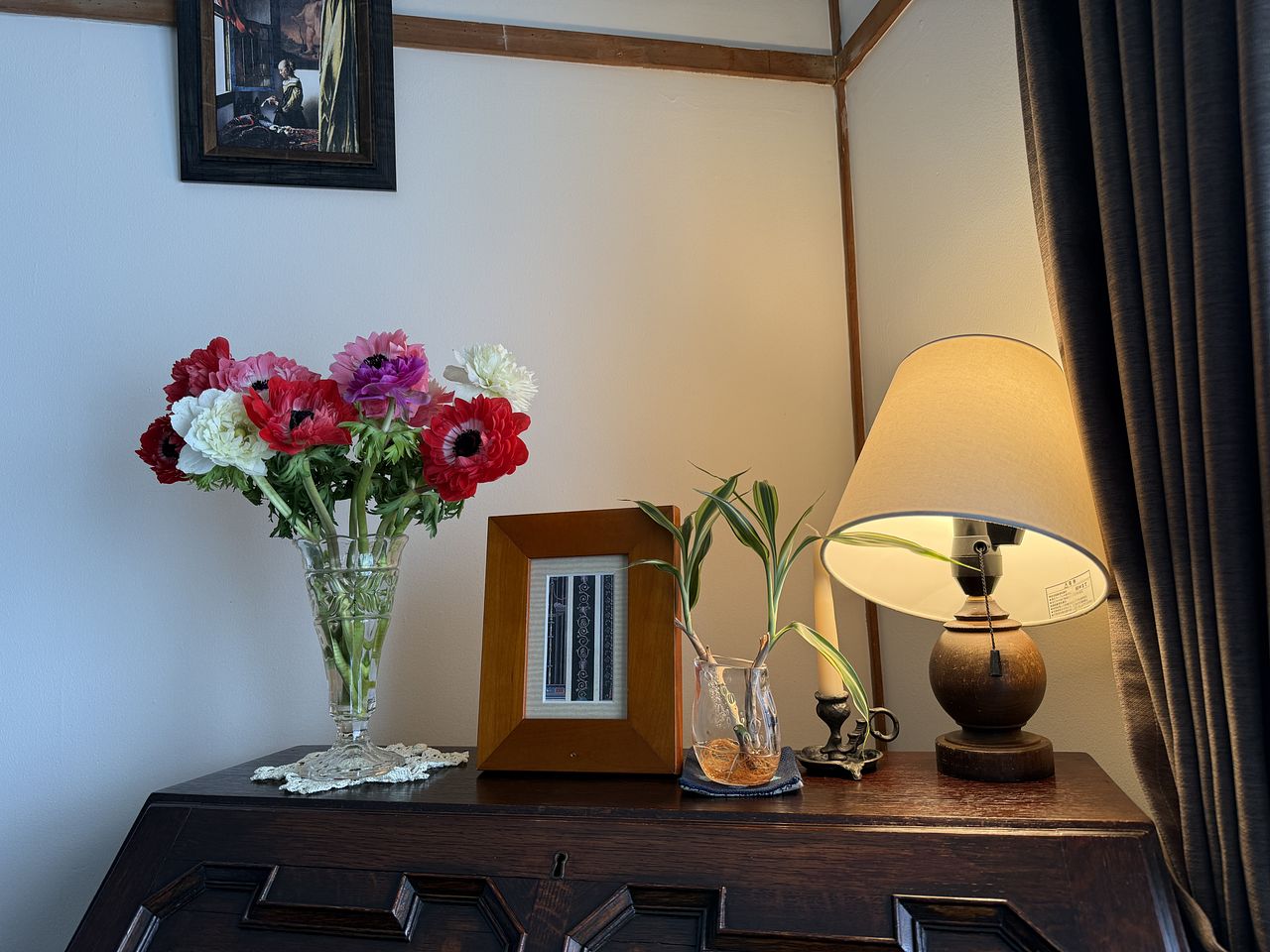 アネモネは一重が好みですが、気分を変えたくて今回は華やかな八重咲を購入いたしました。 本来私の中でアネモネの一番好きな色は紫なのですが、今回のように赤を主軸としたボリュームのあるアネモネ達は、癒しより情熱と元気をくれます。 仕事机にしているイギリス製の古いライティングピューローに飾ったことで、いつもより仕事が捗っているような気が。良いモチベーションになっています。 また利用させていただきます。