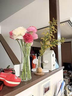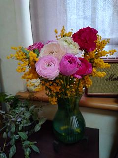 ラナンキュラス8本とミモザが2本。届いた時はラナンキュラスが元気ない感じがしましたが葉を落として水切りしてから水揚げ2〜3時間したら元気よくなりました。ミモザと一緒に飾るのは難しかった!ミモザが短めなのでちょっと位置を直すだけで花瓶の中にミモザがバサバサと落ちます。でもかわいいのでこの状態で少し楽しんだらミモザはドライにしようと思います。手間はかかったけど買ってよかったです。