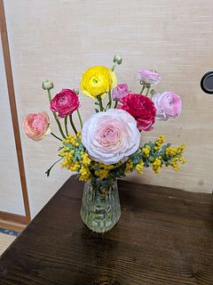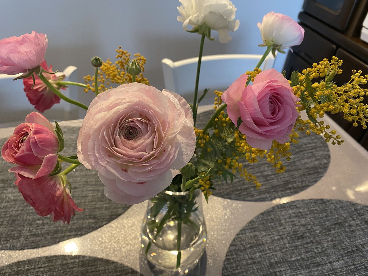 大きさも大ぶりな物から小ぶりの物 色もピンクを中心に、ミモザと一緒の黄色もあって大満足です ラナンの花びらの重なりを見ているだけで幸せになります 一気に春がきました☺