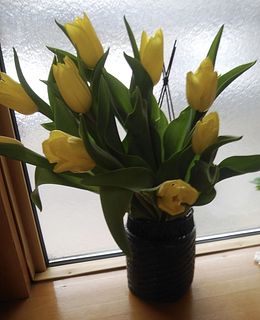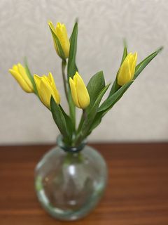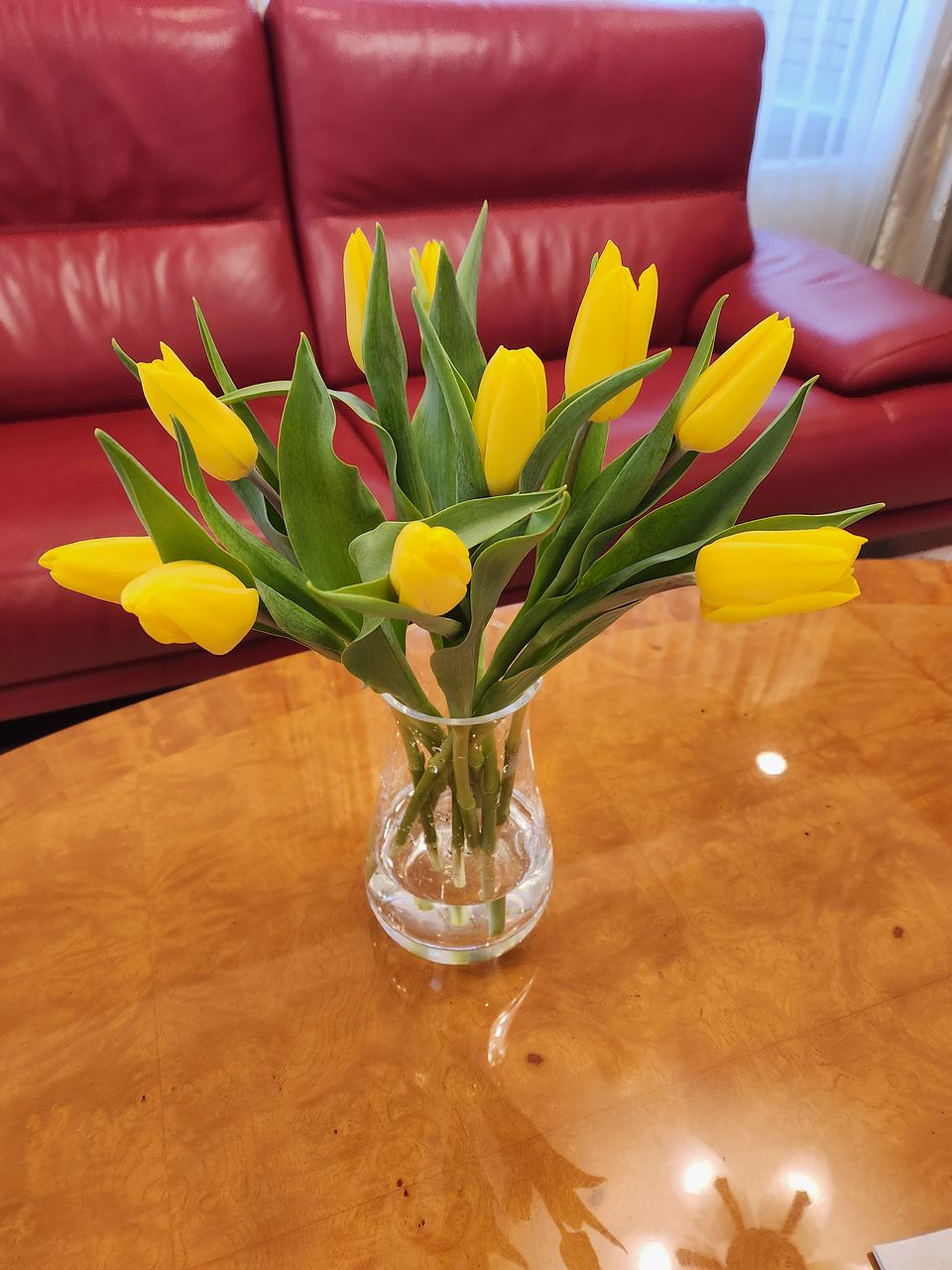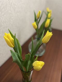 子供達が久しぶりに帰省するのに、明るい部屋で迎えたくて買いました。 元々黄色いチューリップが大好きだったので、このボリュームに大満足です♡ 量が多くて家にあった花瓶に入り狩らなかったので、一輪挿しの花瓶に一本挿して玄関に飾りました。