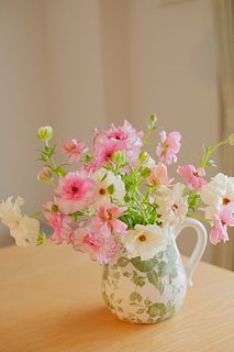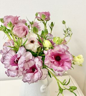 柔らかい色味とツヤ感で、一気に春を感じるお部屋になりました。 開花しているものと蕾のものとのバランスも良かったです。 ラナンキュラスは大好きなお花で、こんな可愛らしいニュアンスの花束は初めてです。 一緒に購入したファゴット(クリア)も、よりお話を引き立ててくれてます。