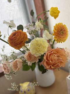 おまかせという事で、バラにガーベラ、カーネーションにポピー、レースフラワーなどボリュームがあって、明るい色合いに、元気をもらえました🥰 ありがとうございました!