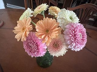 アプリコットピンクやコーラルピンク、ホワイトピンクなどニュアンスカラーのガーベラをギュッと束ねました🍑ころんとした咲き方が最高にキュート。