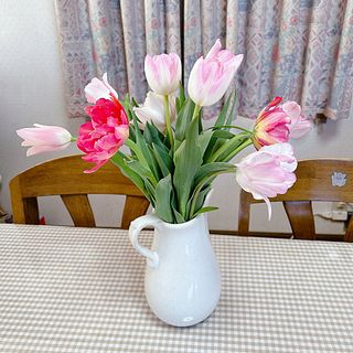 一重咲き、八重咲き、パーロット咲き、クラウン咲き。表情のちがうピンクのチューリップを、ぎゅっと10本集めました🌷
