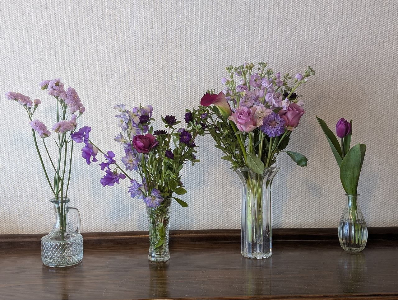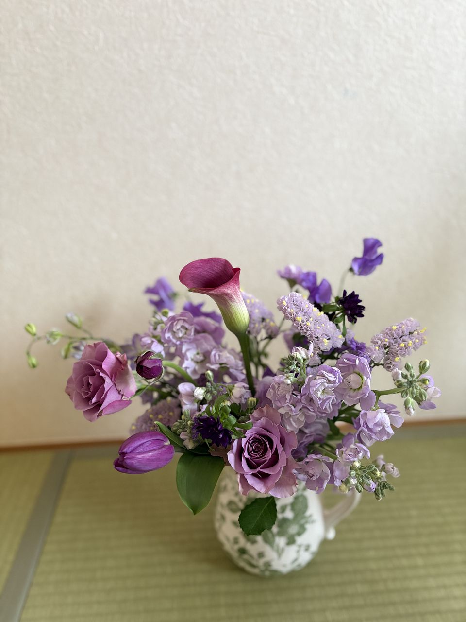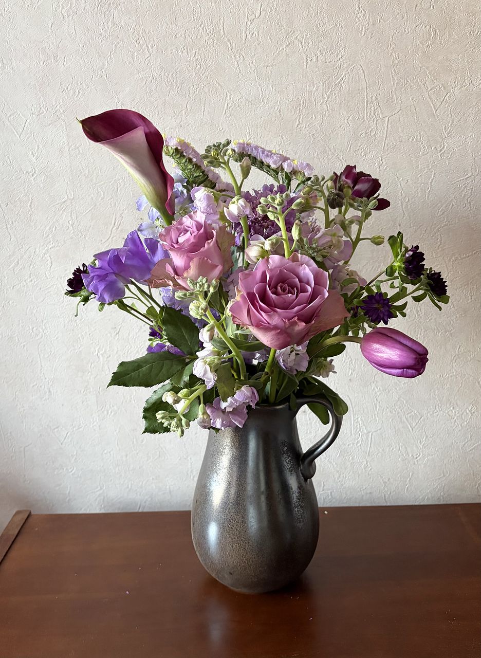 たっぷりなお花が届きました🌸 祖母の好きな紫で、とてもきれいです 嬉しいことに、いつもの花瓶には収まらず、2つに分けて飾っています✨ 個人的には、紫のチューリップ🌷の色がとても好きです💕
