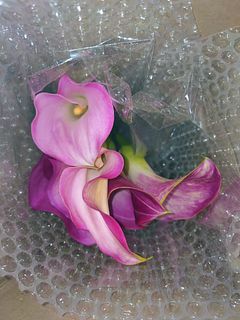 日に何度アプリをひらいてみてもいつもタイミングが合わず純白のカラーを注文できずにいたところ、ピンクをみつけてしまい🥹 数日先におまかせチューリップが届く予定でしたが、合わせてもかわいいかなと追加注文しました。が… 🌷が予想外にいろいろ残念😢😞でしたので、カラーとも合わずどうしようか悩んだところ… 2週間前に届いたさくら色のマムがまだきれいでしたので、一緒に挿してみました。カラー独特の質感でピンクでもシックな雰囲気にまとまり、マムとも予想外にすてきでした🙌🏻💗 追記:カラーリングを考えて挿し直してみました🌷 かわいすぎです😚