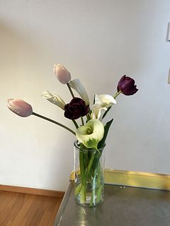 すっと伸びる葉と、カラーのなめらかな曲線、チューリップのやわらかな表情を束ねました🌷