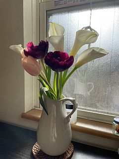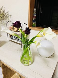 花をまとめているゴムがきつかったのか、カラーの茎にゴム跡が付いていた。 チューリップも見本写真とは異なり、ラブリーなチューリップだったので好みではなく残念。 カラーは大人っぽく生けたい。