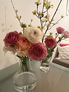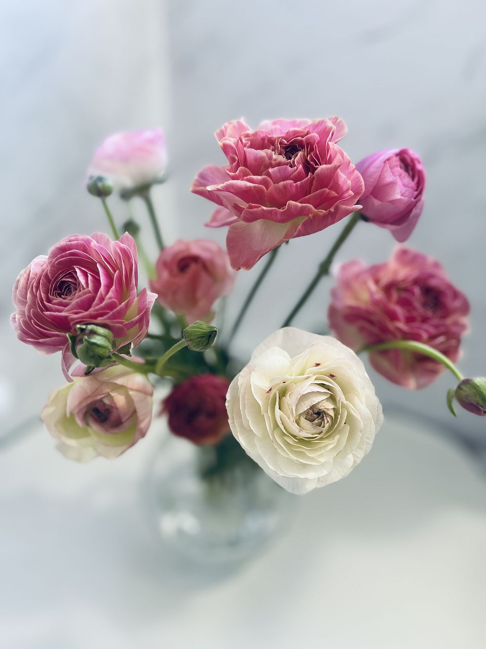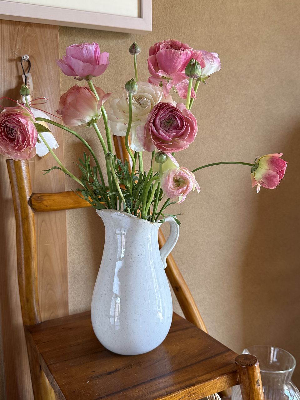 可愛いお色のラナンキュラス🩷 大好きなお花の1つです💕 前回購入の桜が満開で並べて飾っています🌸 長く楽しめるようにお手入れ頑張ります😊