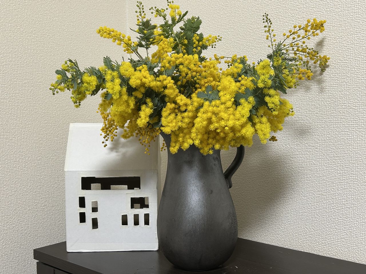 おすすめ花器その1「Calore」。マットなブラックとミモザの組み合わせが新鮮。