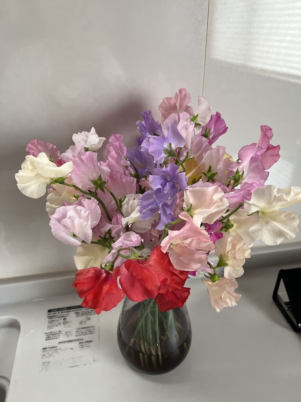 春らしく華やかで、とても良い香りのスイートピーでした。 花は元気でカラフル、ボリュームもあり、飾るだけで部屋が明るく、嬉しい空間になりました。