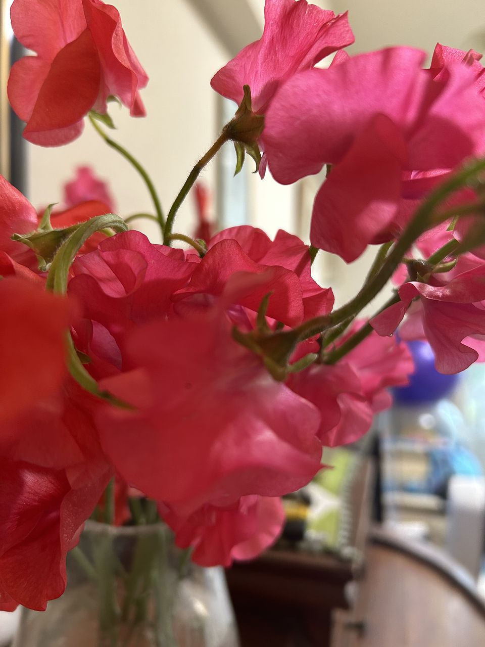心の岸辺に咲いた赤いスイトピー。 聖子ちゃんのあの歌を思い出しながら、自分の誕生日に「自分はよく頑張ってるで!」と花を飾りました。 あまり赤い花は手に取る事がありませんが、私の年齢にはクリティカルヒットな赤いスイトピー。 赤よりはピンク寄りなスイトピーも混ざっていますが、それがまた逆に赤をグッと引き立ててバランス良く感じました。 窓辺で揺れる花びらが光に透けて、とてもきれい。 今の自分にそっと寄り添ってくれています。
