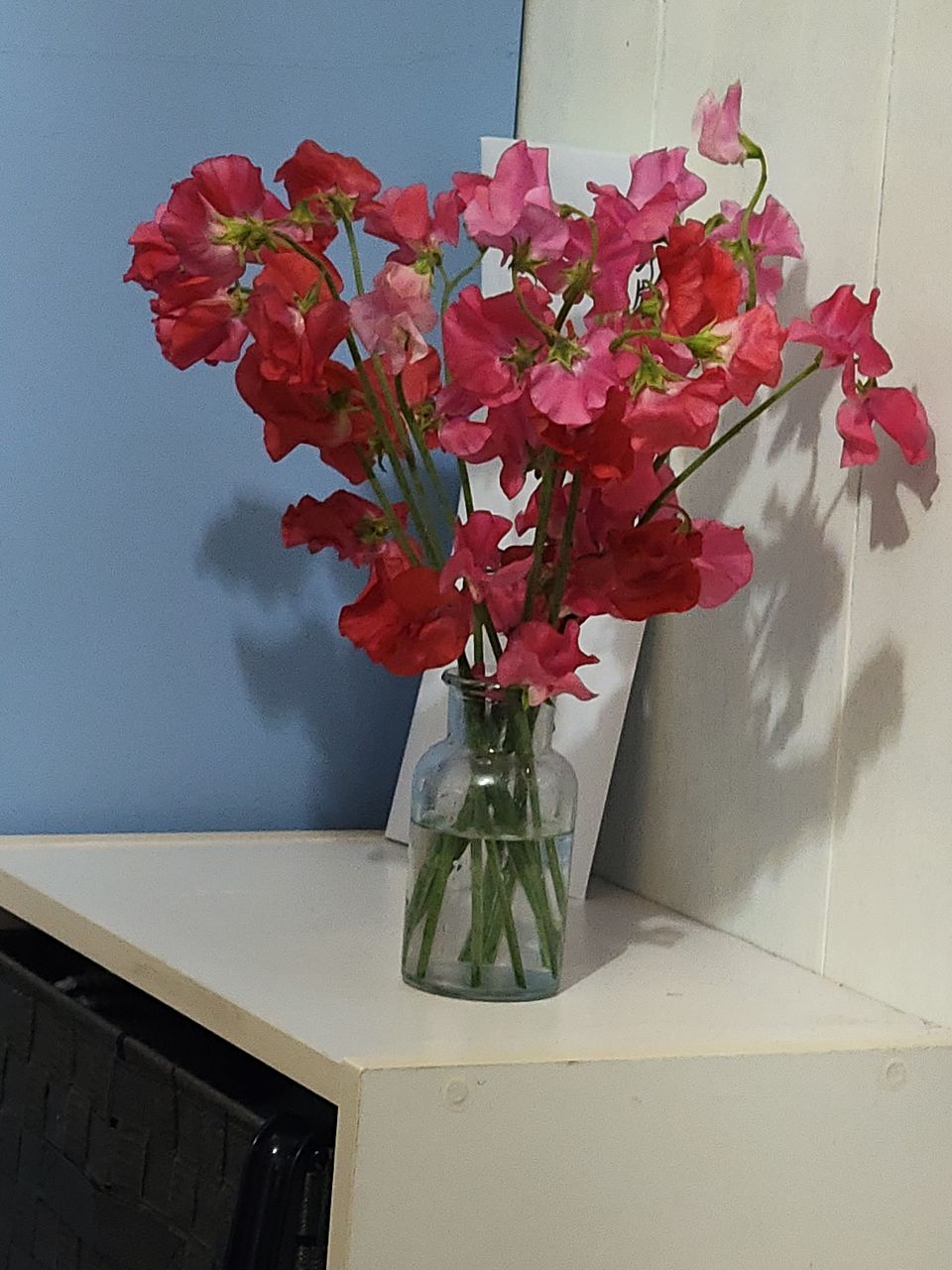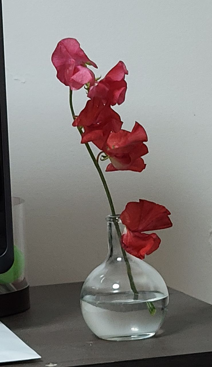 とても、可愛いい 赤いスイートピー今、フラワーベースを 悩み中です。これも楽しい時間