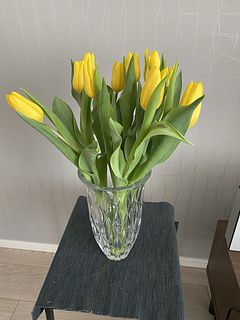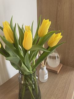 子供達が久しぶりに帰省するのに、明るい部屋で迎えたくて買いました。 元々黄色いチューリップが大好きだったので、このボリュームに大満足です♡ 量が多くて家にあった花瓶に入り狩らなかったので、一輪挿しの花瓶に一本挿して玄関に飾りました。