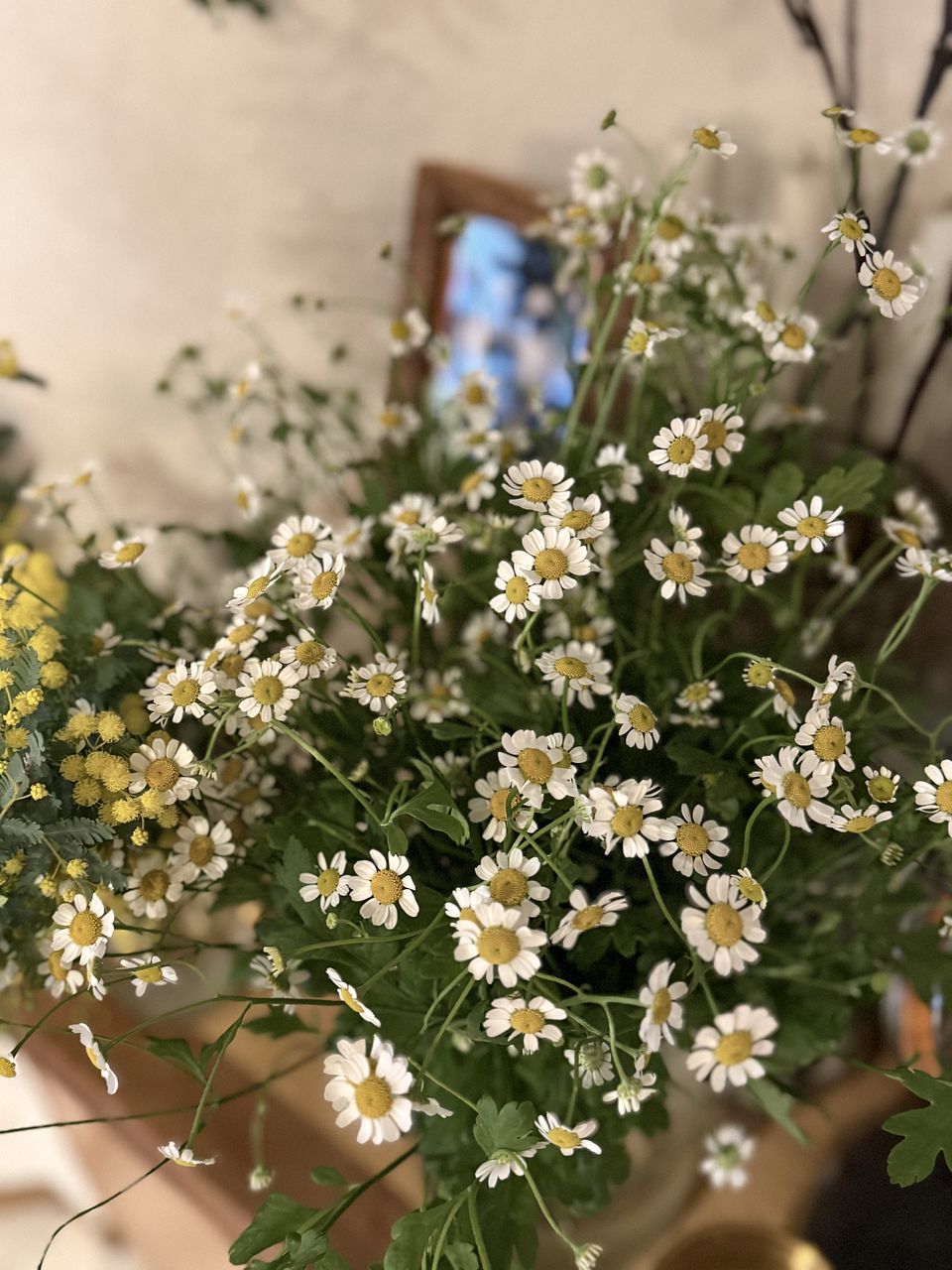 ちょうどフワッと咲いたミモザと白い小花のマトリカリア、とっても可愛く、春を感じています。