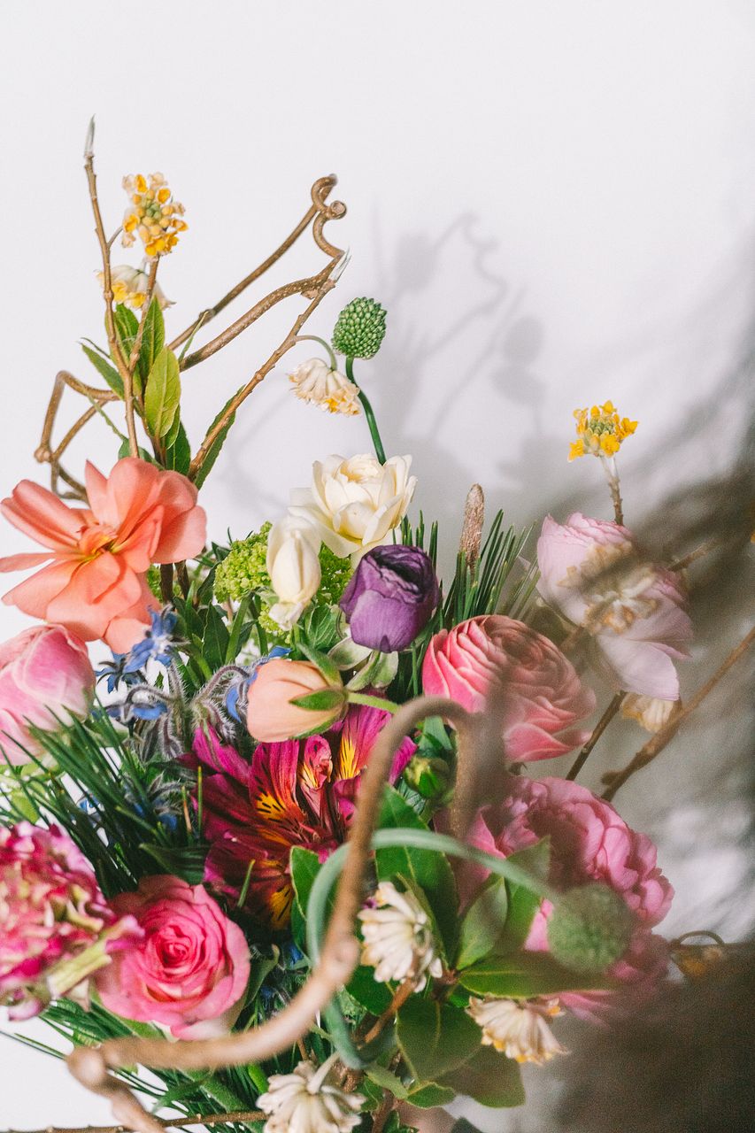 今回は旬の枝物やユニークな蔓、松などにチューリップやバラ、ラナンキュラスなど