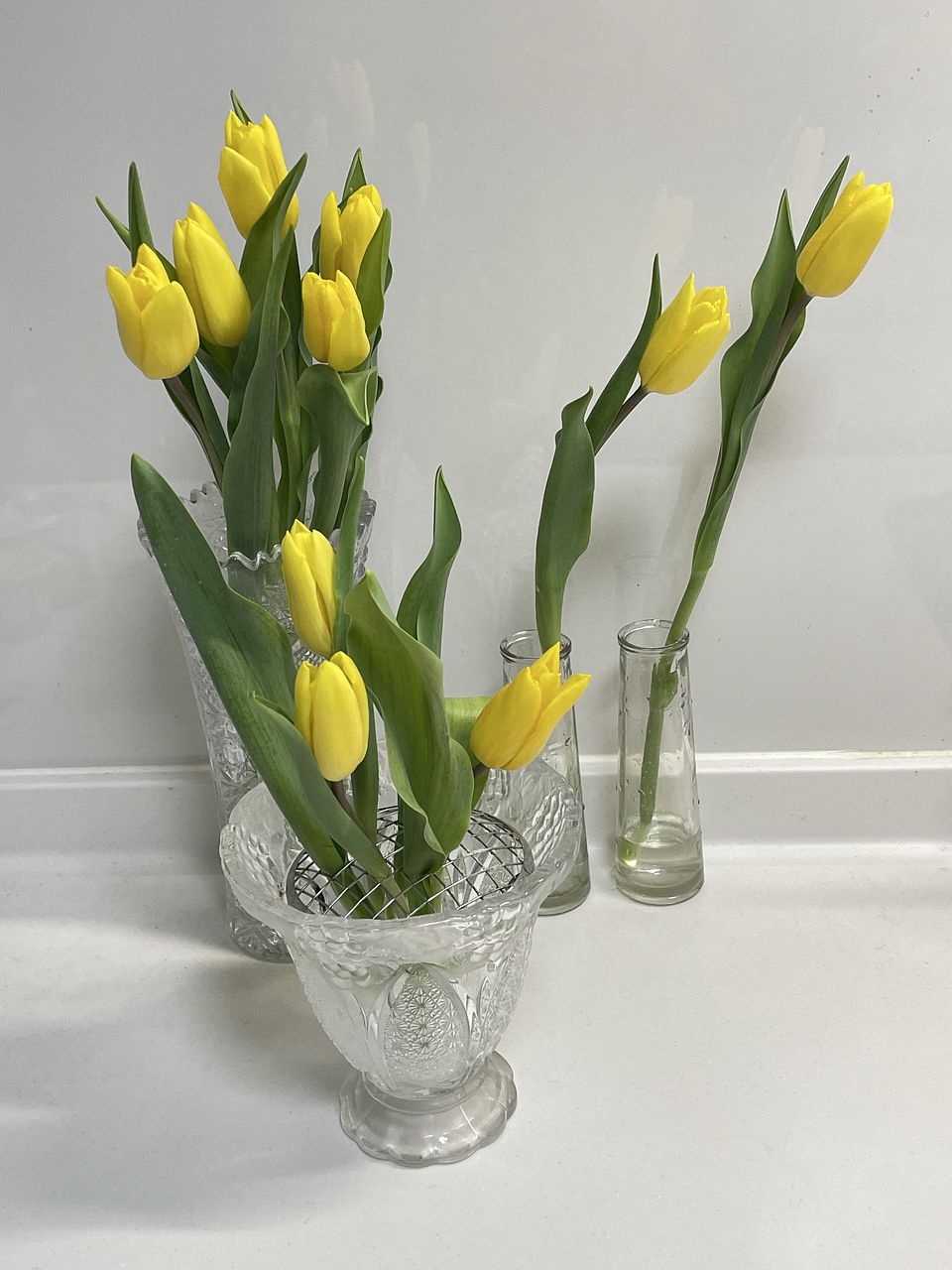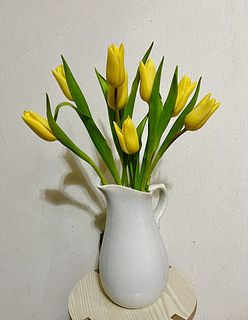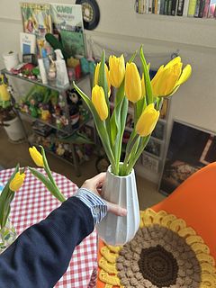 子供達が久しぶりに帰省するのに、明るい部屋で迎えたくて買いました。 元々黄色いチューリップが大好きだったので、このボリュームに大満足です♡ 量が多くて家にあった花瓶に入り狩らなかったので、一輪挿しの花瓶に一本挿して玄関に飾りました。