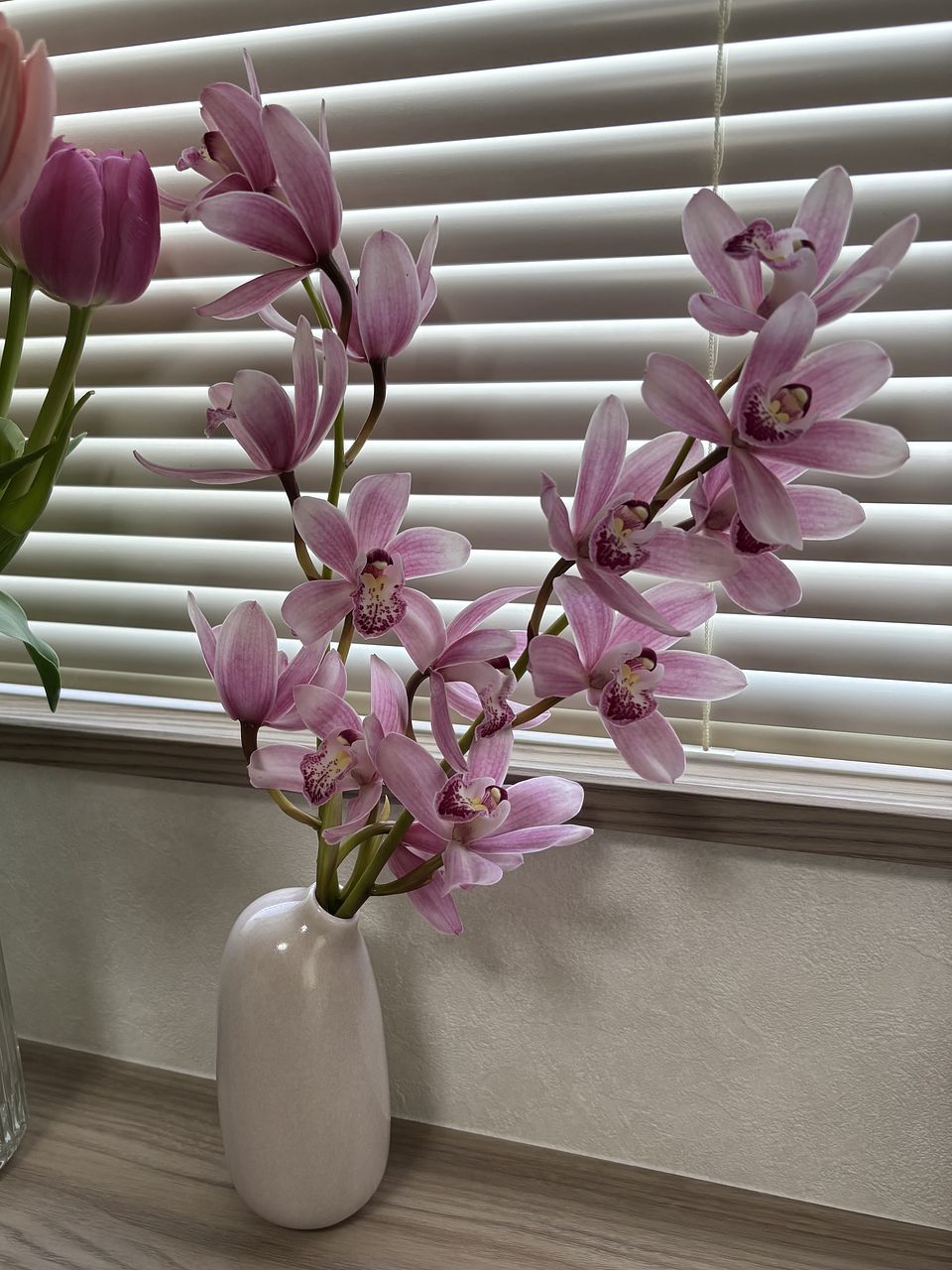 「テーブルシンビ」と呼ばれる石田さんのシンビジウムは、限られたスペースにも飾りやすいサイズ感が魅力。コンパクトながら存在感があり、一輪置くだけで絵になる佇まいです。洗面台やデスクなど、お家のあちこちで楽しめます。