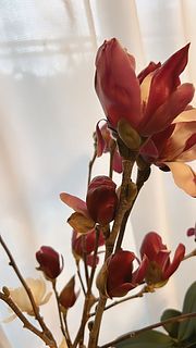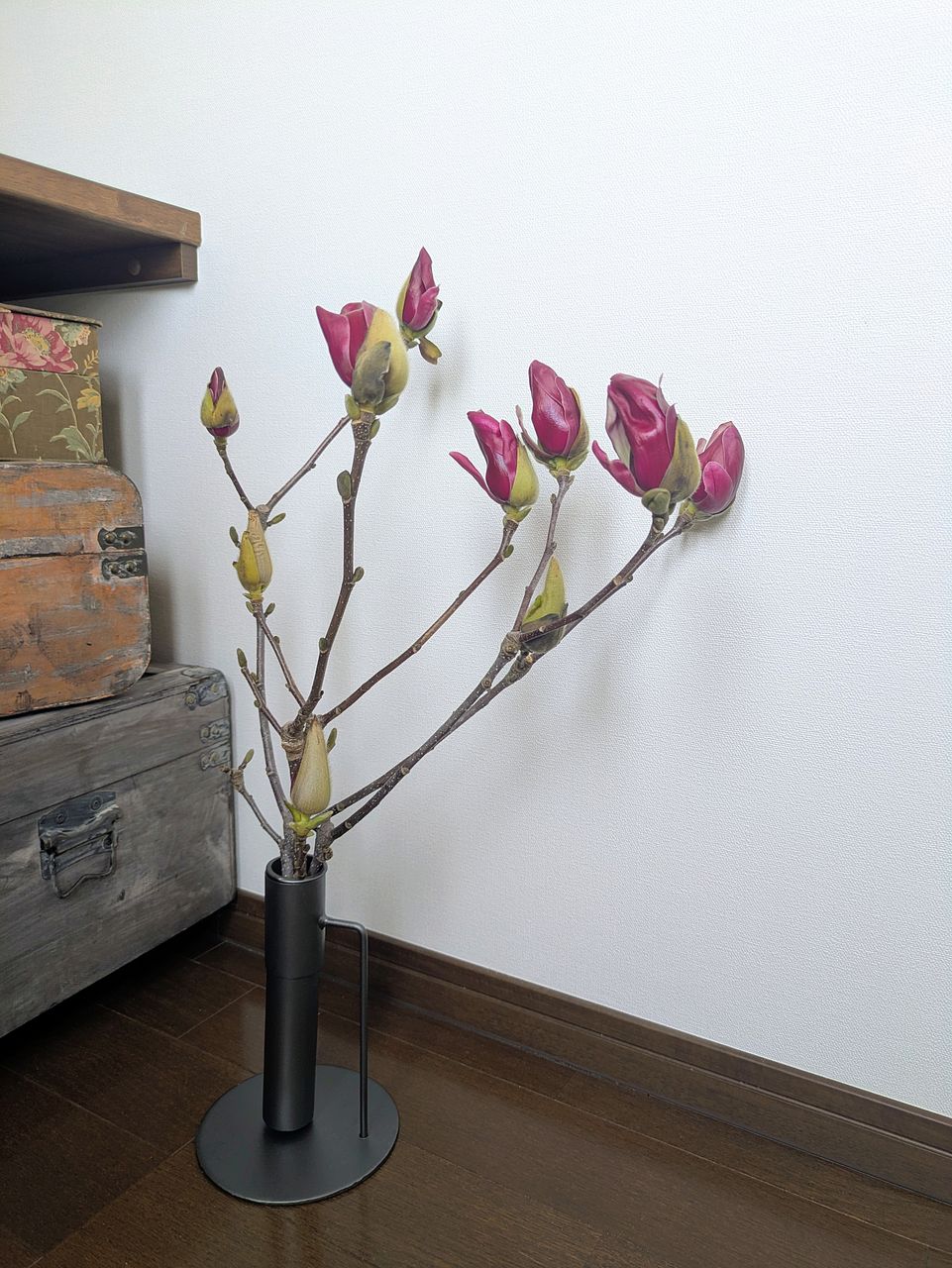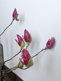 先日届いた白木蓮の花びらが散ってきたちょうど良いタイミングで販売されていた錦木蓮を注文しました。 フローリストのたいちさんが「咲いたらとても美しい」とおっしゃっていたので家の中で愛でたくて✨ まだ蕾ですがすでに蕾の外側の皮が取れてきて赤紫芋色に色付いています。MarsのLに入れました。 3本でも立派で咲くのがとても楽しみです♡