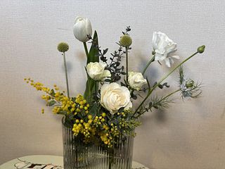 ミモザをメインにホワイト、イエローなどキュンとする春のお花をチョイス🐣ミモザの季節もあと少し。お買い逃しなく。