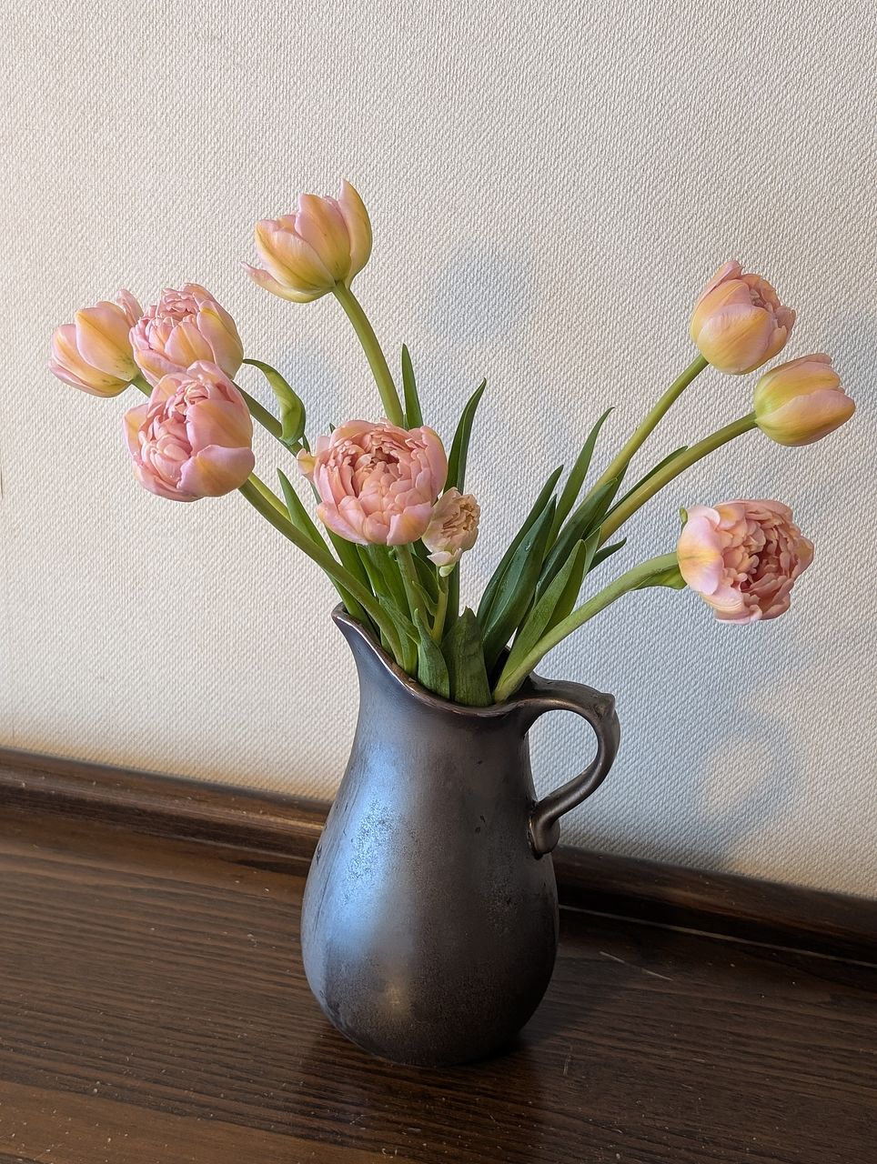 YouTubeを見て、八重咲きチューリップと花瓶を購入しました😊箱を開けた瞬間ギュッとした蕾が! 花瓶もシックで素敵✨ 小さな蕾も咲いてくれるか楽しみです😊