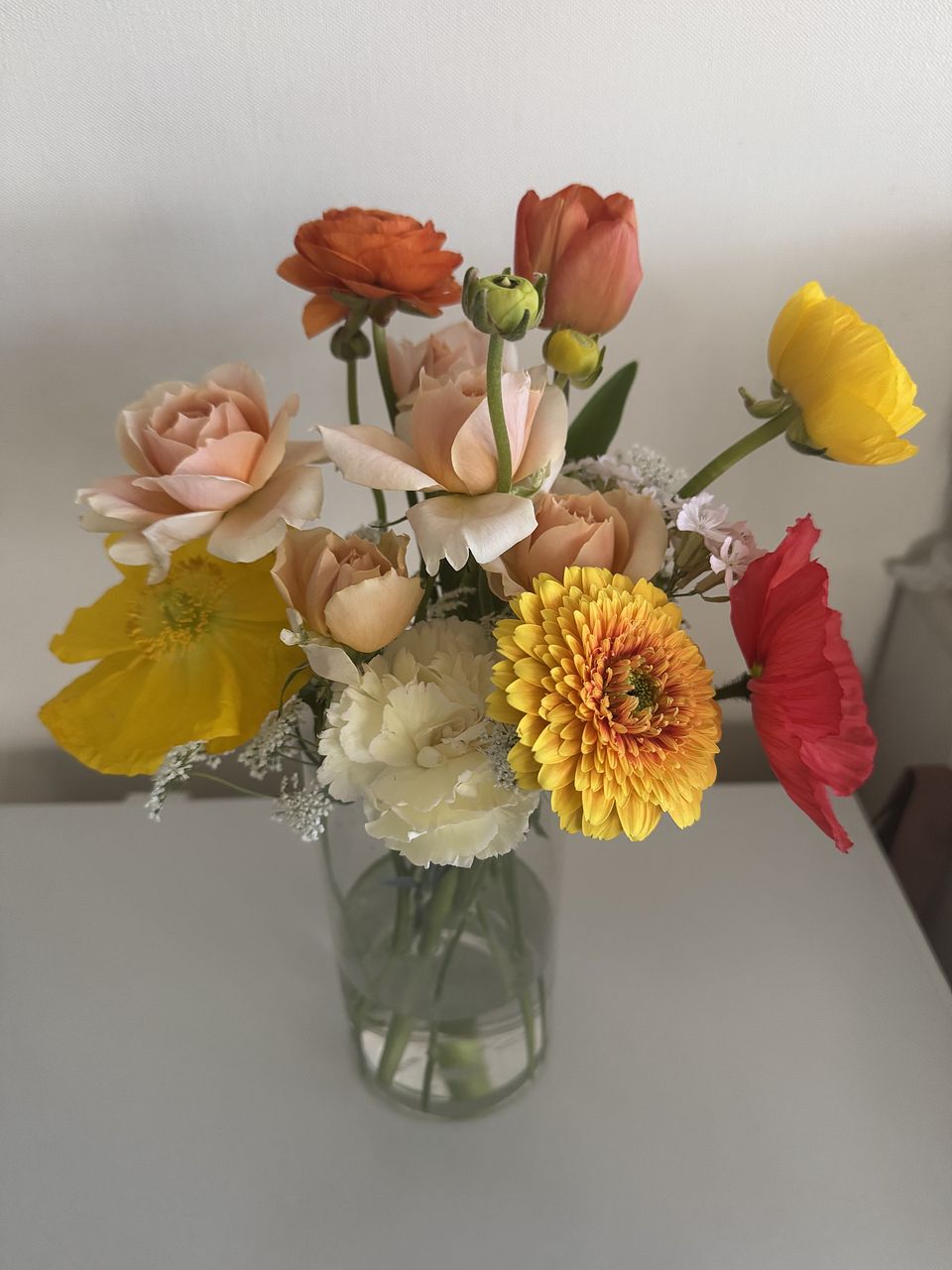 おまかせという事で、バラにガーベラ、カーネーションにポピー、レースフラワーなどボリュームがあって、明るい色合いに、元気をもらえました🥰 ありがとうございました!