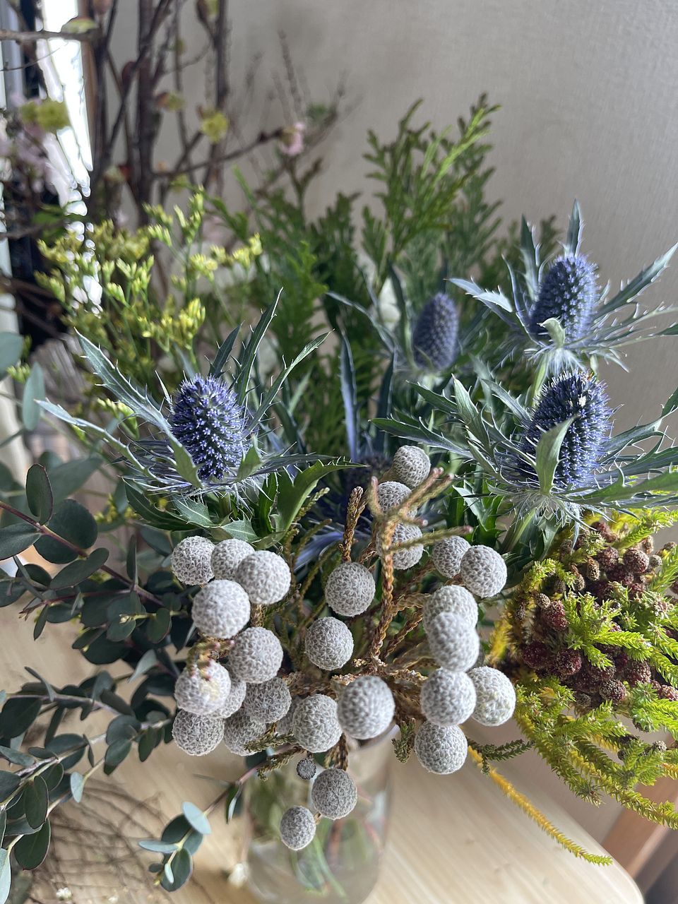 届いてすぐにスワッグに仕立てたのですが、エリンジウムのツボミがたくさん!開花の様子も見たくて全部花瓶に活けました。変化を楽しんでいきたいです。