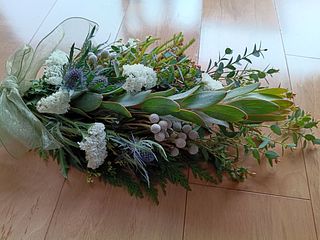 初めての注文です。 しばらく生花を楽しんだ後、 家のヘンリーヅタのツルを土台にリースにしました。 派手な花材ではありませんがナチュラルな色合いで好みです。 ヒバやユーカリの良い香りに癒されています。