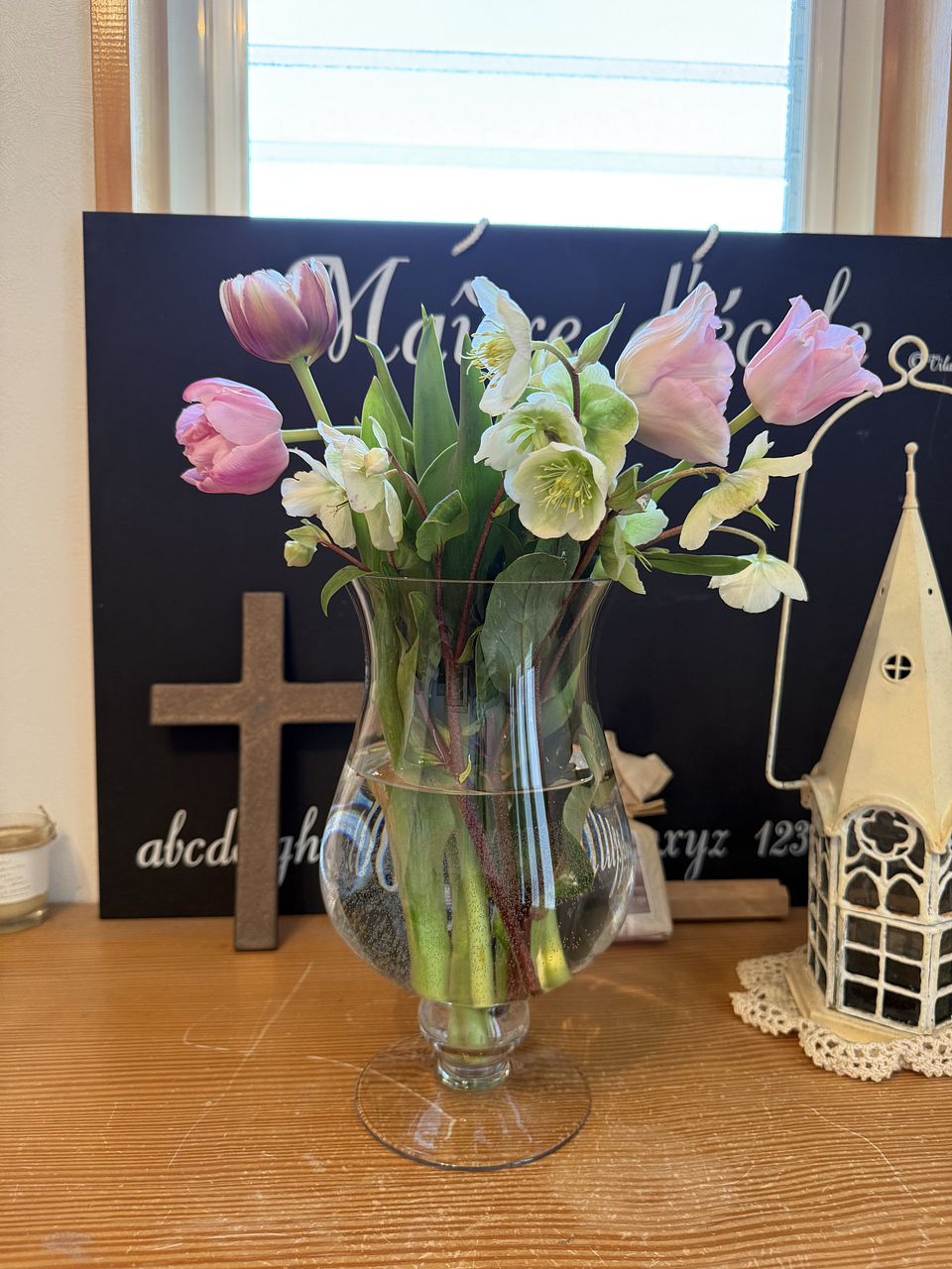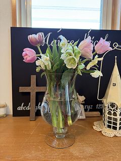 チューリップ3種類と元気なクリスマスローズのコラボ。ボリュームありすぎて一緒の花瓶に入りきらなかったから別々だけど長持ちしそうだしかなりお得意です!