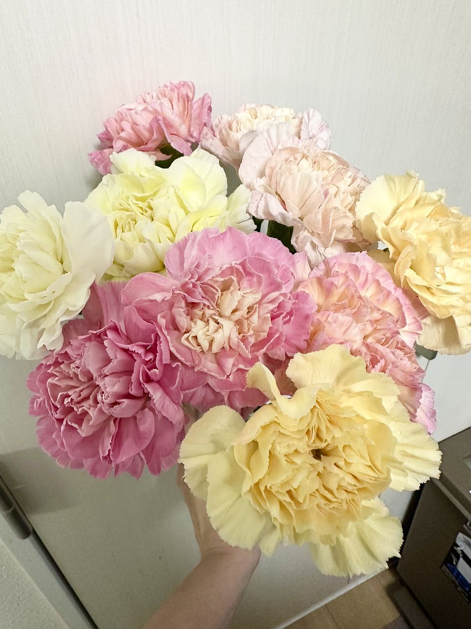 明るいピンクやイエローに元気をもらえる☀️カーネーション「ミナミシリーズ」をミックスで9〜10本お届けします。