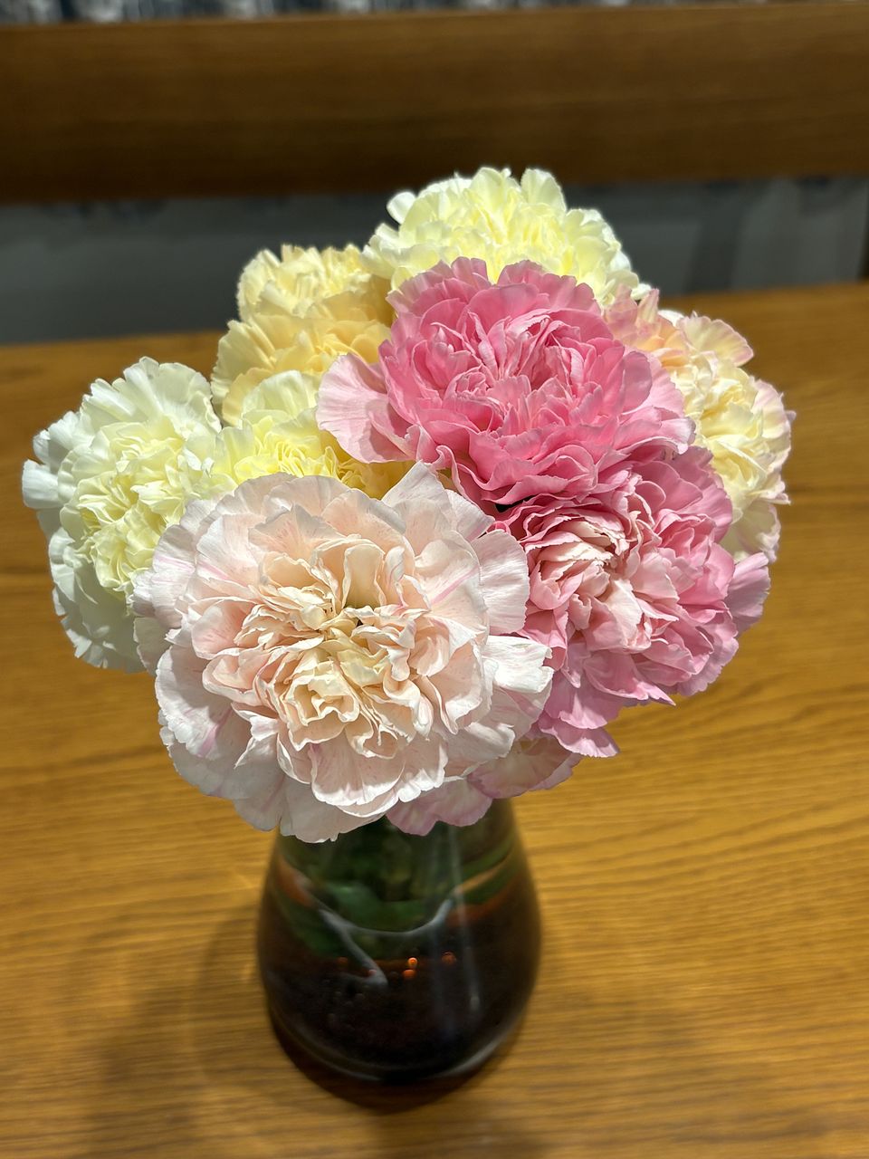 可愛らしいパステルニュアンスカラーです。カーネーションは花弁が落ちなくて長い間楽しめるのが良いです。