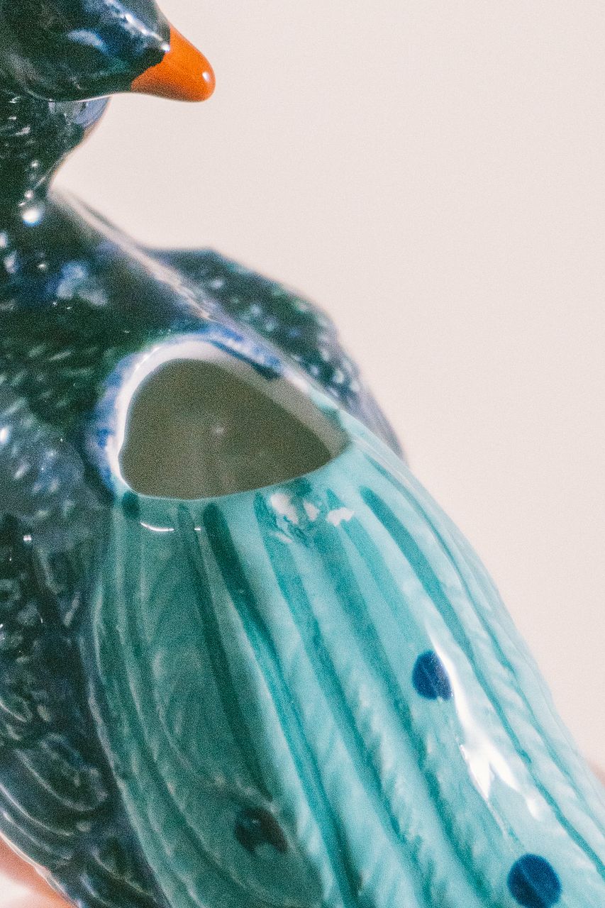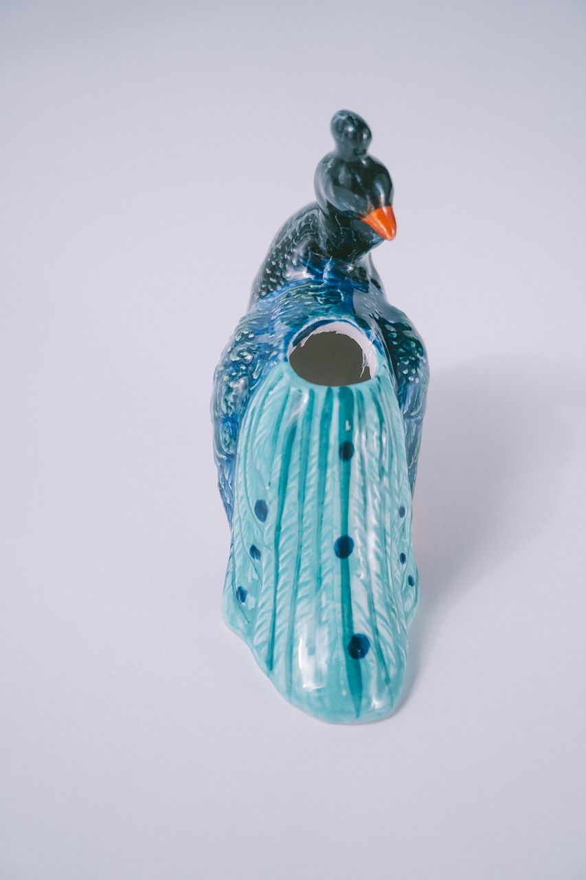 羽づくろい中かな...😌こちらを振り向く姿が美しいクジャクの一輪挿しはインテリアとしてもかわいいです🦚
