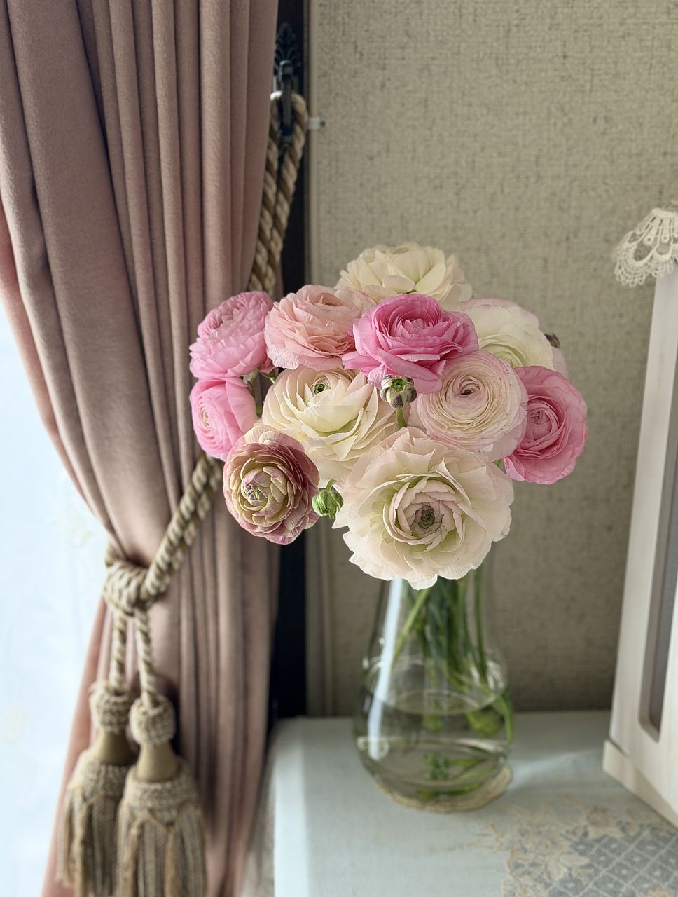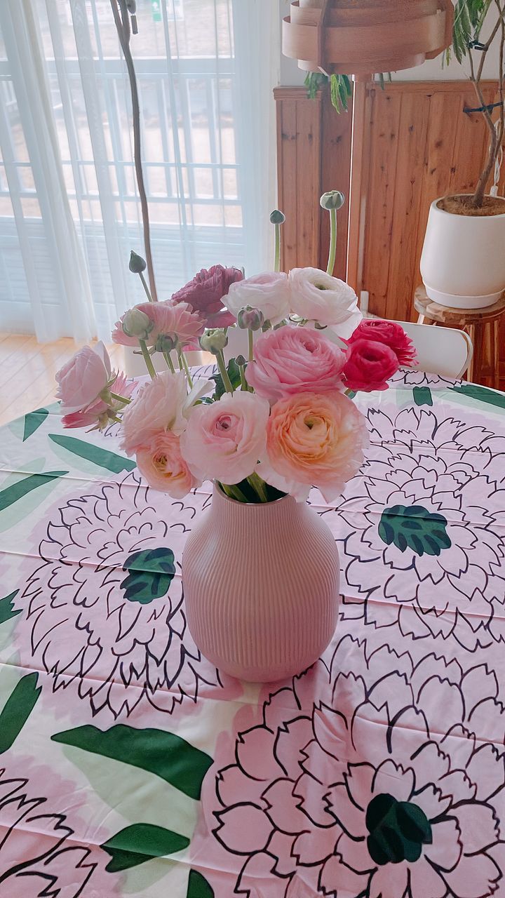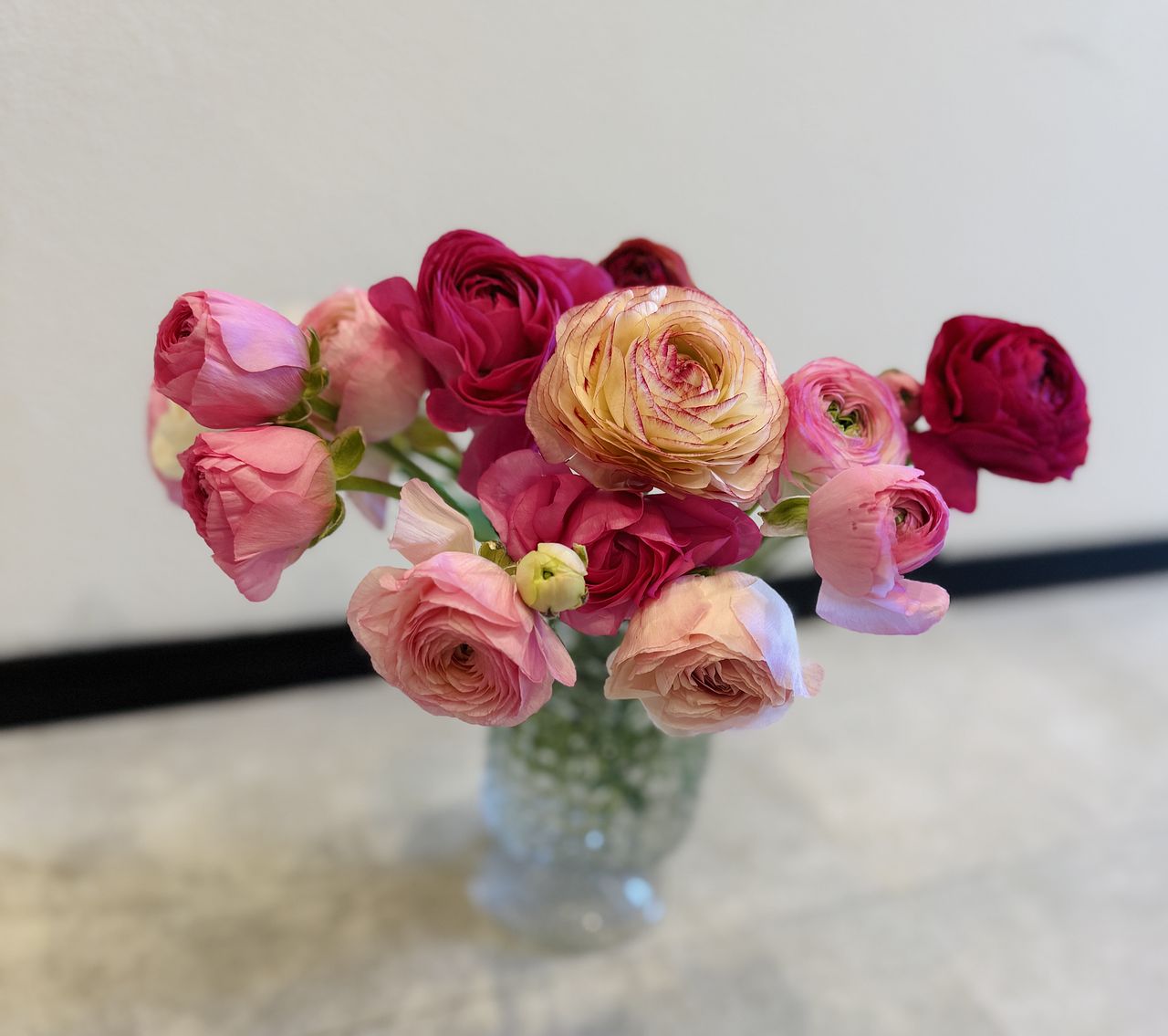 かわいいラナンキュラス🩷ピンクにも色んな色があり、花びらの形も少しずつ違い、とても華やかで素敵です。ボリュームもたっぷりでリビングが贅沢な空間になりました✨