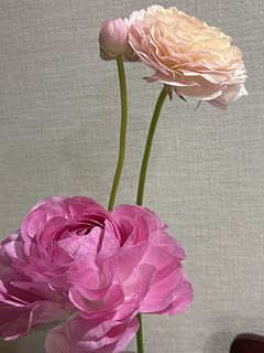 色も白っぽい薄めのピンク、桜色ピンク、オレンジがかったピンクとグラデーション豊かな可愛らしいラナンキュラスたちが届きました。つぽみも何個かあり楽しみです。 包装も2つに分けて頂いて分けても飾りやすいように配慮されて有り難いです。 花も茎も葉も活きが良くて嬉しいです! ファゴットグレーも一緒に頼みました。 存在感のある花器で安定感があり、色もいい。どんな花や枝つきものでも合いそうで本当におすすめです。
