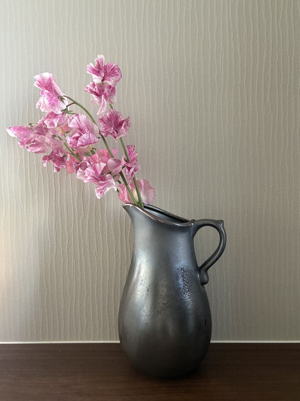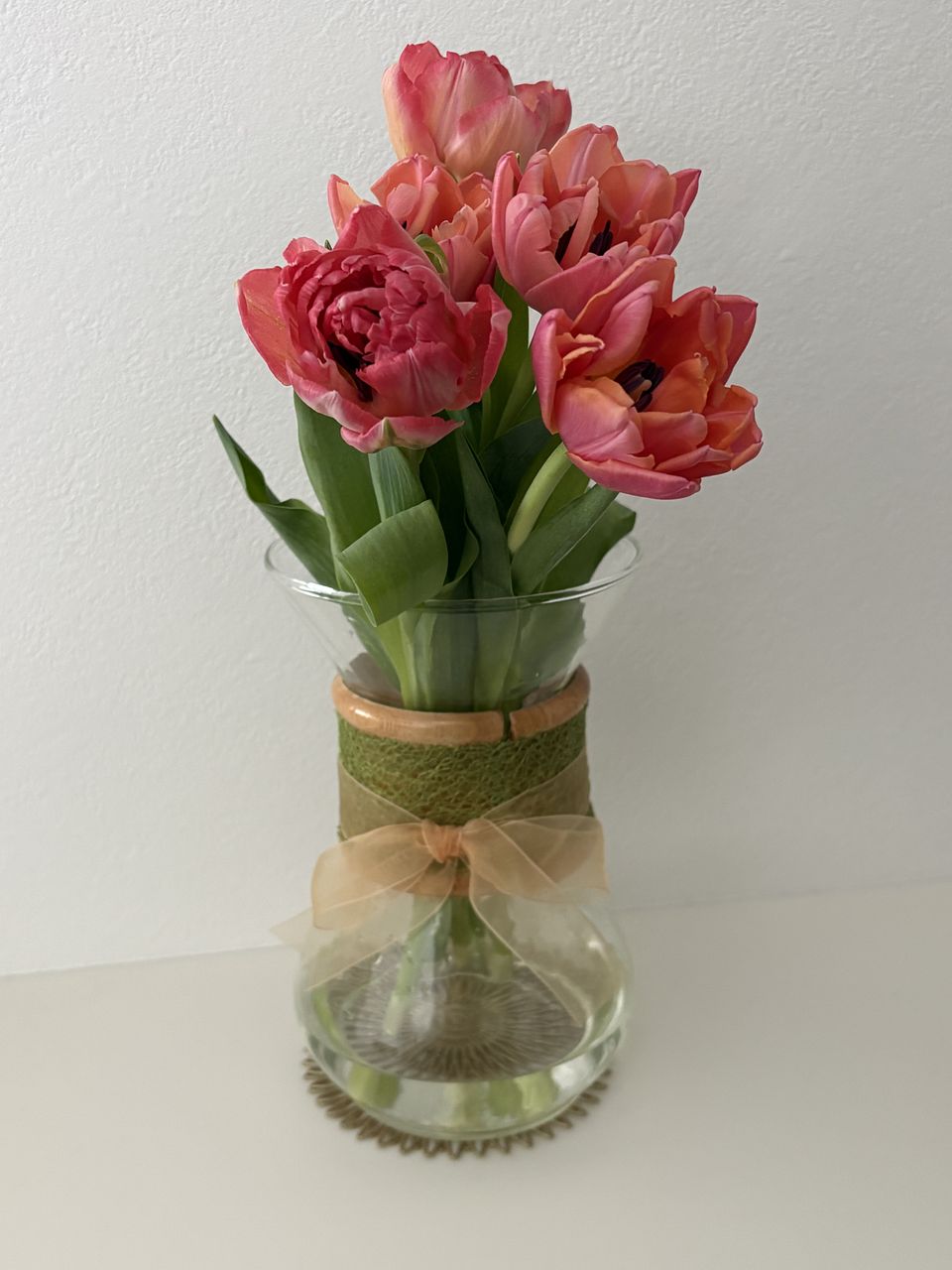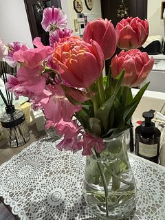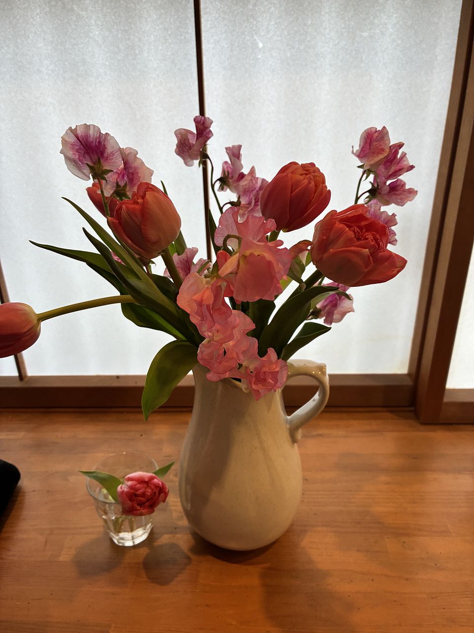 前回紫のチューリップとスイトピーのブーケがとってもお気に入りでした。今回はピンク系で思ったよりチューリップの色が濃かったけれど 飾るとやっぱり可愛いです。