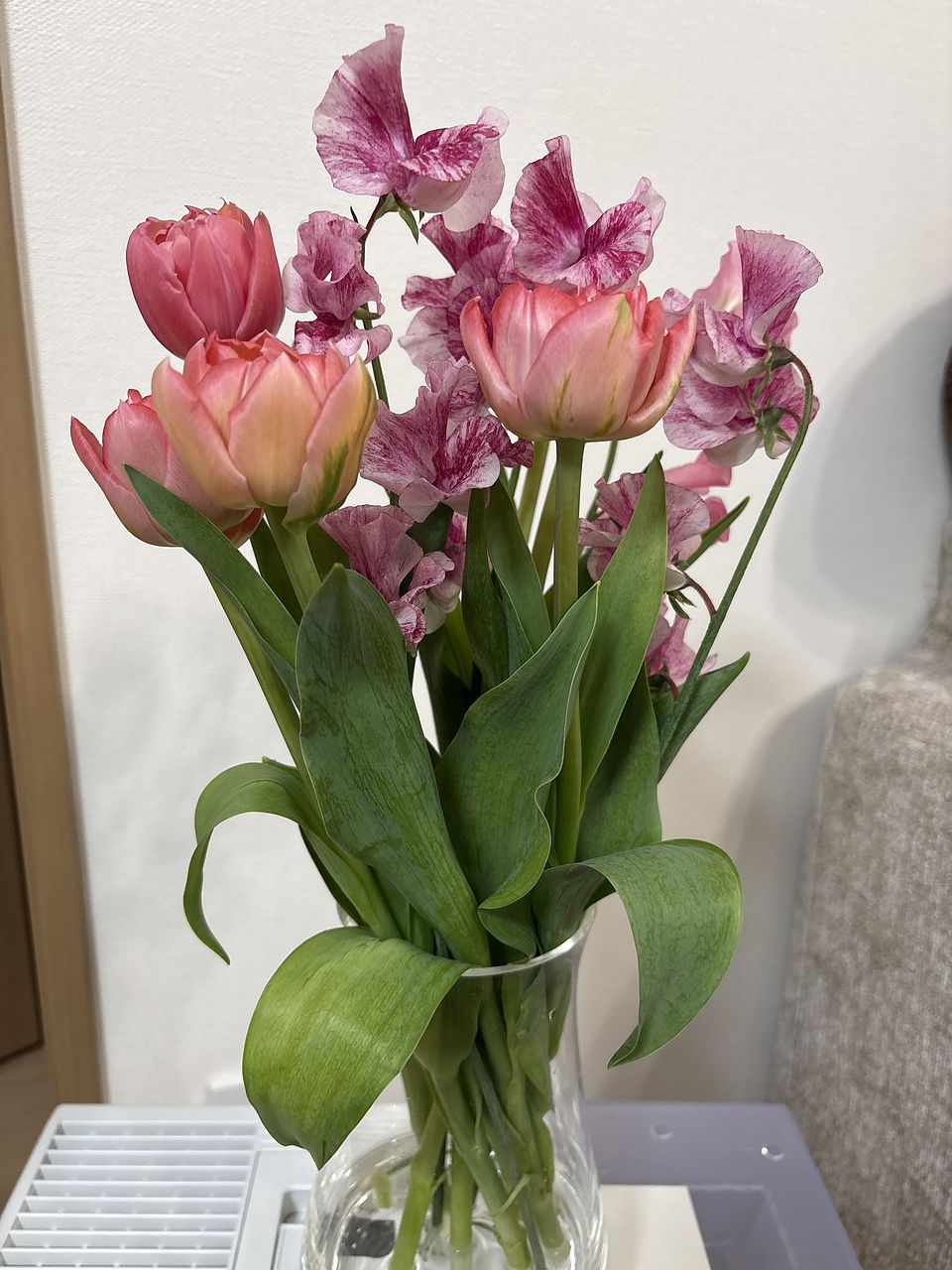 可愛らしいチューリップとスイトピーのブーケ♡が 届きました。ピンク系で一気にお部屋に春がきました。