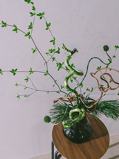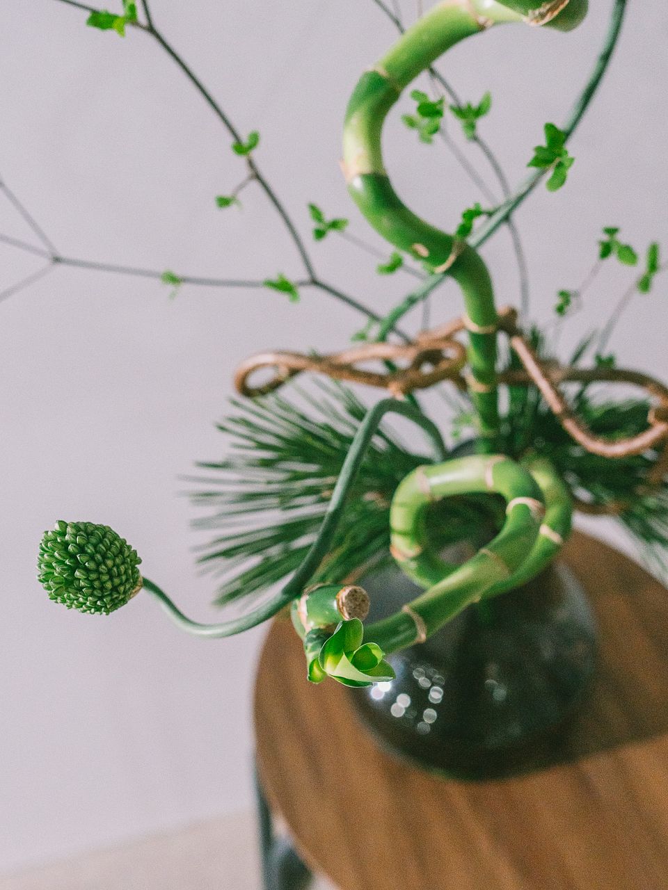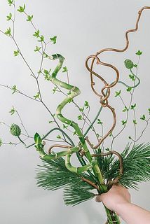幸運の花言葉を持つスパイラルバンブー(ミリオンバンブー)をメインに、クネクネした動きをもつ枝物達を集めました🐍