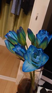 届いて次の日。お水に青の着色料が染みます。 細めのフラワーベースで入ります。 お花が開くのが楽しみです🩵